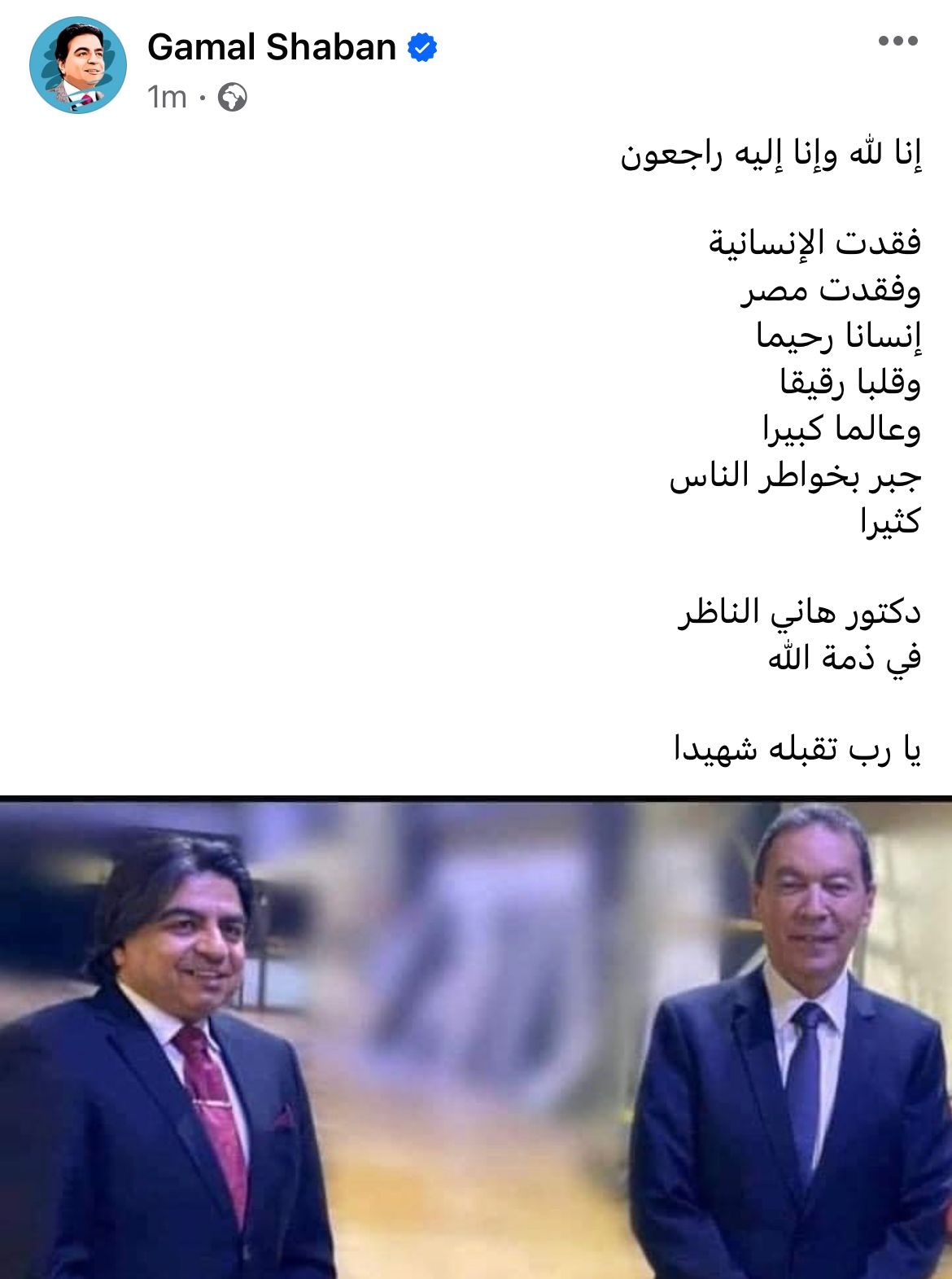 كما كتب الدكتور جمال شعبان على حسابه الشخصي على فيس بوك: إنا لله وإنا إليه راجعون فقدت الإنسانية، وفقدت مصر، إنسانًا رحيمًا، وقلبًا رقيقا، وعالمًا كبيرُا، جبر بخواطر الناس، كثيرًا، دكتور هاني الناظر في ذمة الله يا رب تقبله شهيدًا.