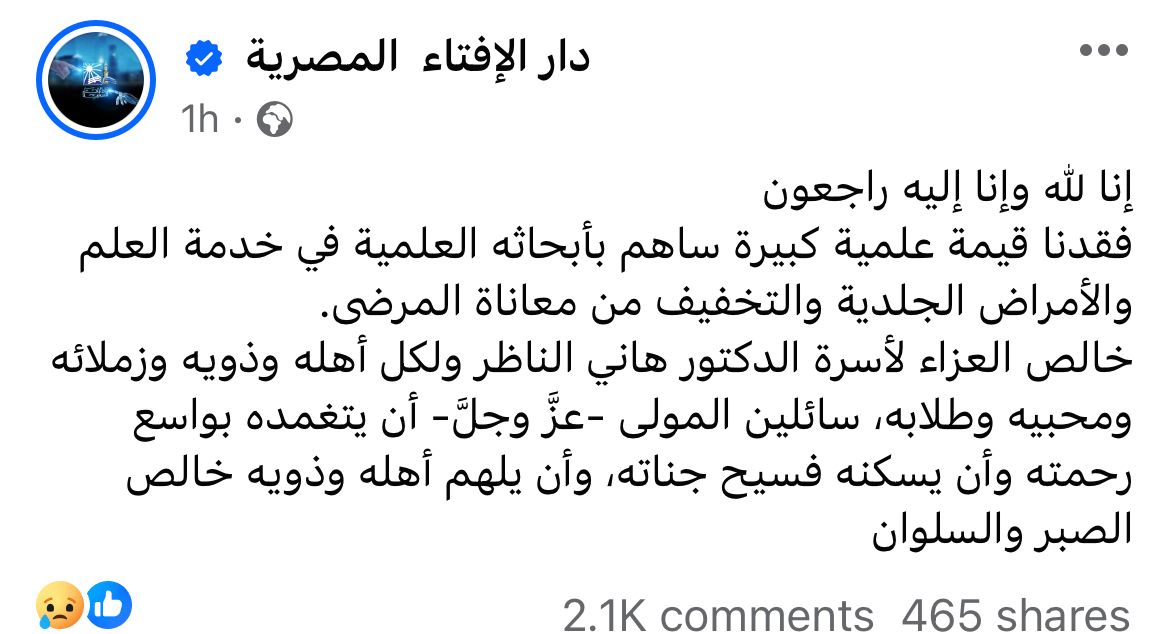 كما نعت دار الإفتاء المصرية وفاة الدكتور هاني الناظر وكتبت: إنا لله وإنا إليه راجعون فقدنا قيمة علمية كبيرة ساهم بأبحاثه العلمية في خدمة العلم والأمراض الجلدية والتخفيف من معاناة المرضى.