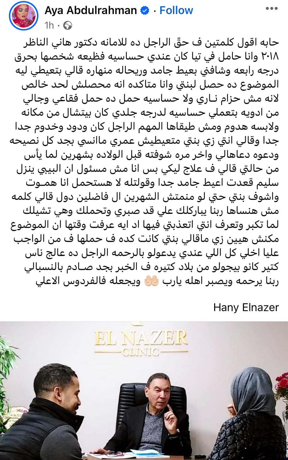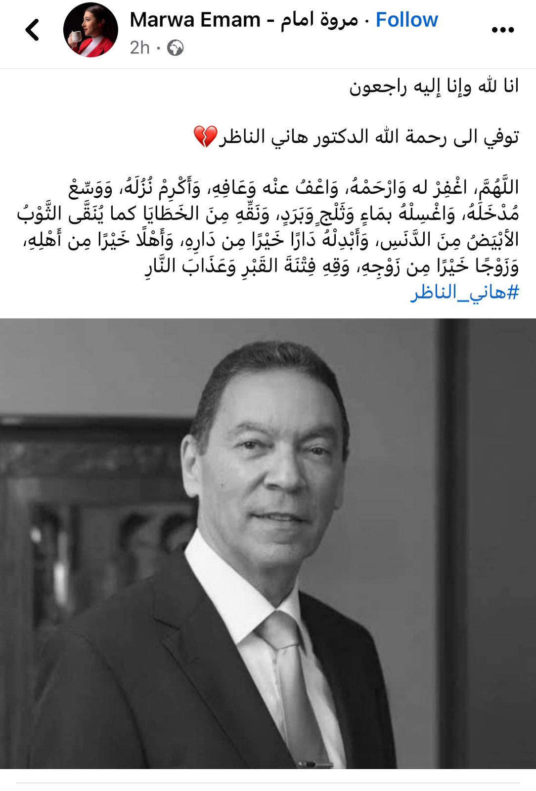 وتابعت: خالص العزاء لأسرة الدكتور هاني الناظر ولكل أهله وذويه وزملائه ومحبيه وطلابه، سائلين المولى -عزَّ وجلَّ- أن يتغمده بواسع رحمته وأن يسكنه فسيح جناته، وأن يلهم أهله وذويه خالص الصبر والسلوان.