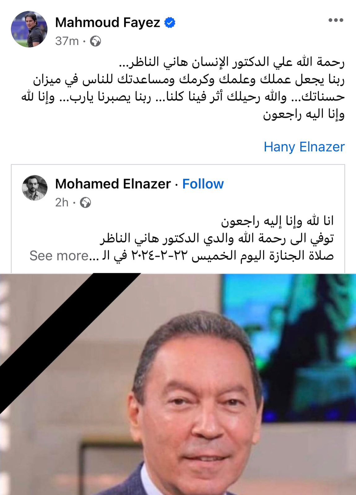 نعى عدد كبير من مشاهير الوطن العربي والمسؤولين الدكتور هاني الناظر، ونشروا على صفحاتهم الشخصية رسائل التعزية والنعي موضحين مدى حزنهم على فقدان طبيب وشخصية مصرية عظيمة.