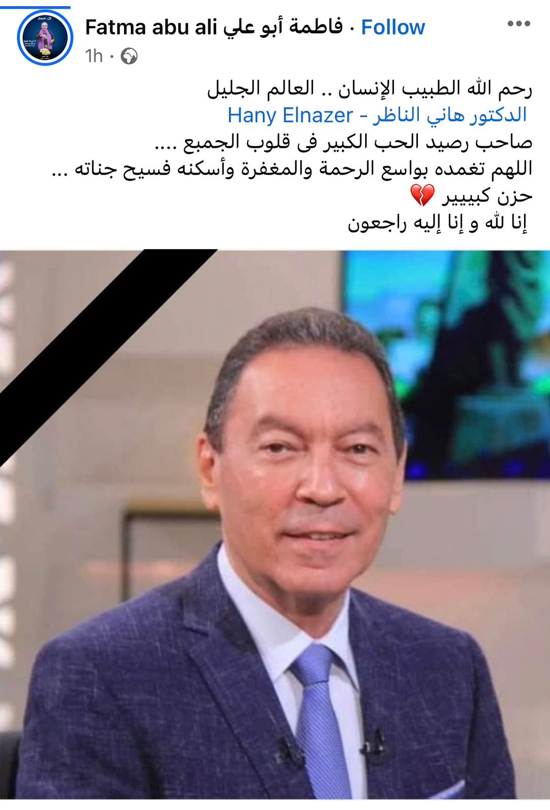 ضجت مواقع التواصل الاجتماعي بخبر وفاة الدكتور هاني الناظر، حيث تحولت إلى دفاتر تعزية تنعى وفاة الدكتور، وقام عدد كبير من المشاهير ورواد السوشيال ميديا بتقديم العزاء والتعبير عن مدى حزنهم بهذا الخبر.