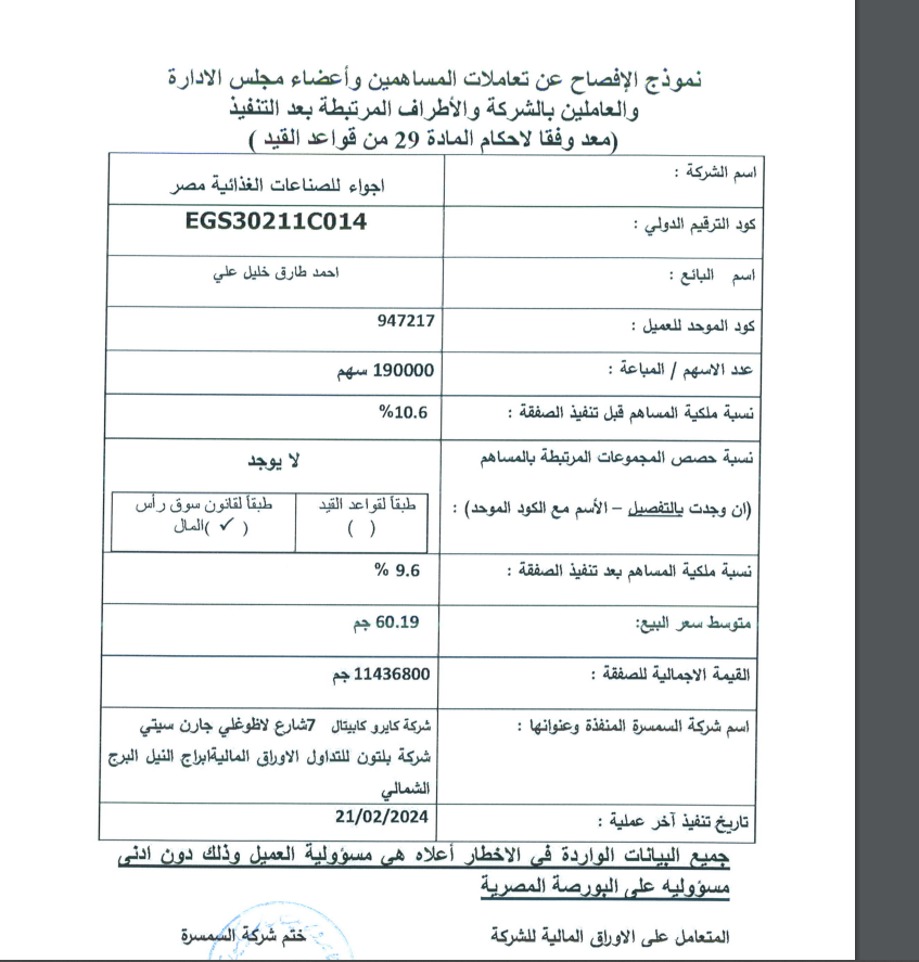 خفض المساهم أحمد طارق خليل علي حصته في شركة أجواء للصناعات الغذائية-مصر من 10.6% إلى 9.6%، حيث بلغت عدد الأسهم المباعة 190000 سهم، بمتوسط سعر بيع 60.19 جنيه للسهم الواحد.