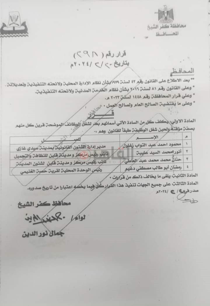 وتضمن قرار محافظ كفر الشيخ، الذي حصل القاهرة 24 على صورة ضوئية منه، أن حركة التنقلات شملت حركة التنقلات نقل كل من، محمود أحمد عبد التواب زغلول، للعمل مدير إدارة الشئون القانونية بمدينة سيدي غازي، وتكليف أنور محمد السيد عليبة، للعمل نائب رئيس مركز ومدينة قلين للنظافة والتجميل، وكذلك تكليف حنان محمد محمد عبد العاطي، للعمل نائب رئيس مركز ومدينة قلين لشئون المدينة، وتكليف رمضان أبو طالب مصطفي دغيم للعمل رئيس الوحدة المحلية لقرية حصة الغنيمي.