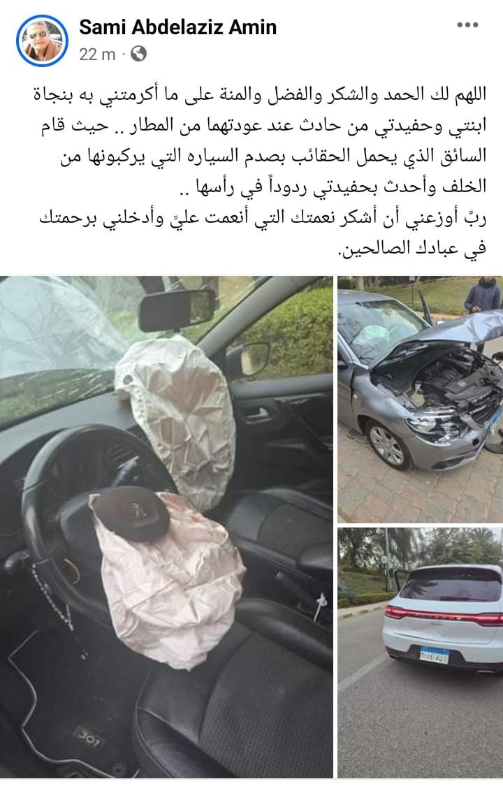 وتابع سامي عبد العزيز: حيث قام السائق، الذي يحمل الحقائب بصدم السيارة التي يركبونها من الخلف، وأحدث بحفيدتي رضوضا في رأسها، رب أوزعني أن أشكر نعمتك التي أنعمت علي وأدخلني برحمتك في عبادك الصالحين.