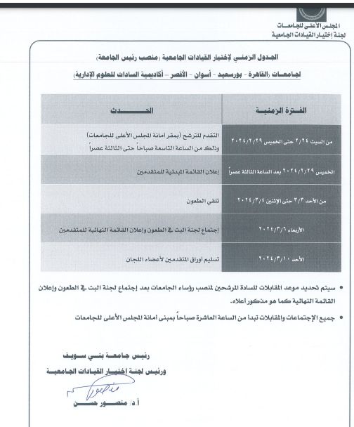 قرر المجلس الأعلى للجامعات، فتح باب التقديم للترشح لمنصب رئيس الجامعة/ الأكاديمية، اليوم السبت، لجامعات القاهرة، بورسعيد، أسوان، الأقصر، أكاديمية السادات للعلوم الإدارية.