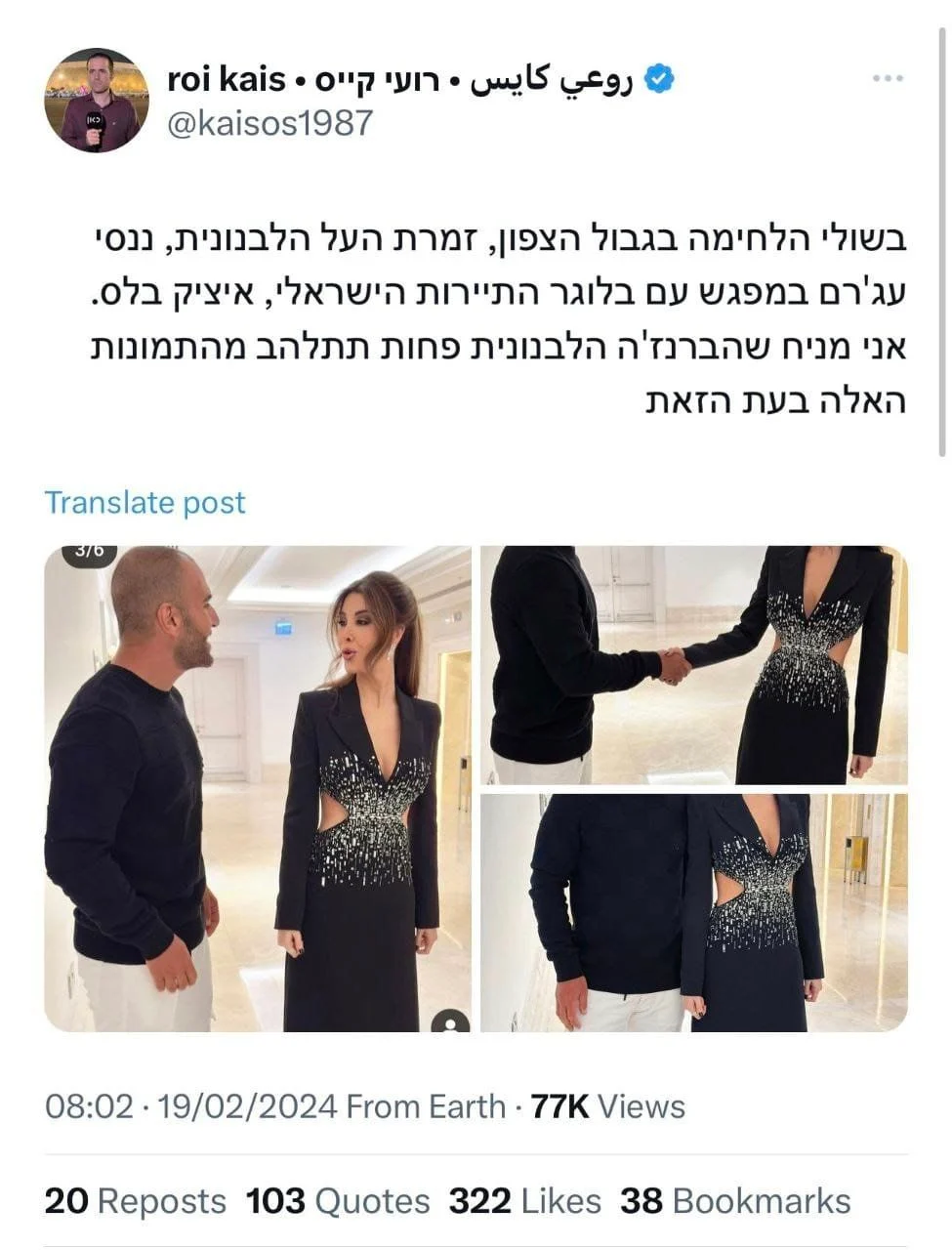 علقت الفنانة اللبنانية نانسي عجرم على أزمة ظهورها مع مدون سياحة إسرائيلي، بعد انتهاء حفلها الأخير في دولة قبرص، الأمر الذي عرضها لهجوم وانتقادات كثيرة، وصلت لاتهامها بالتطبيع، خاصة في ظل الأحداث الأليمة التي نشهدها بسبب الاحتلال الإسرائيلي الغاشم على غزة.