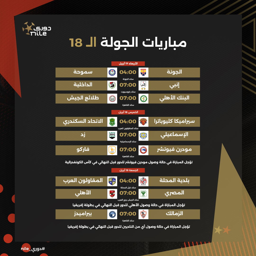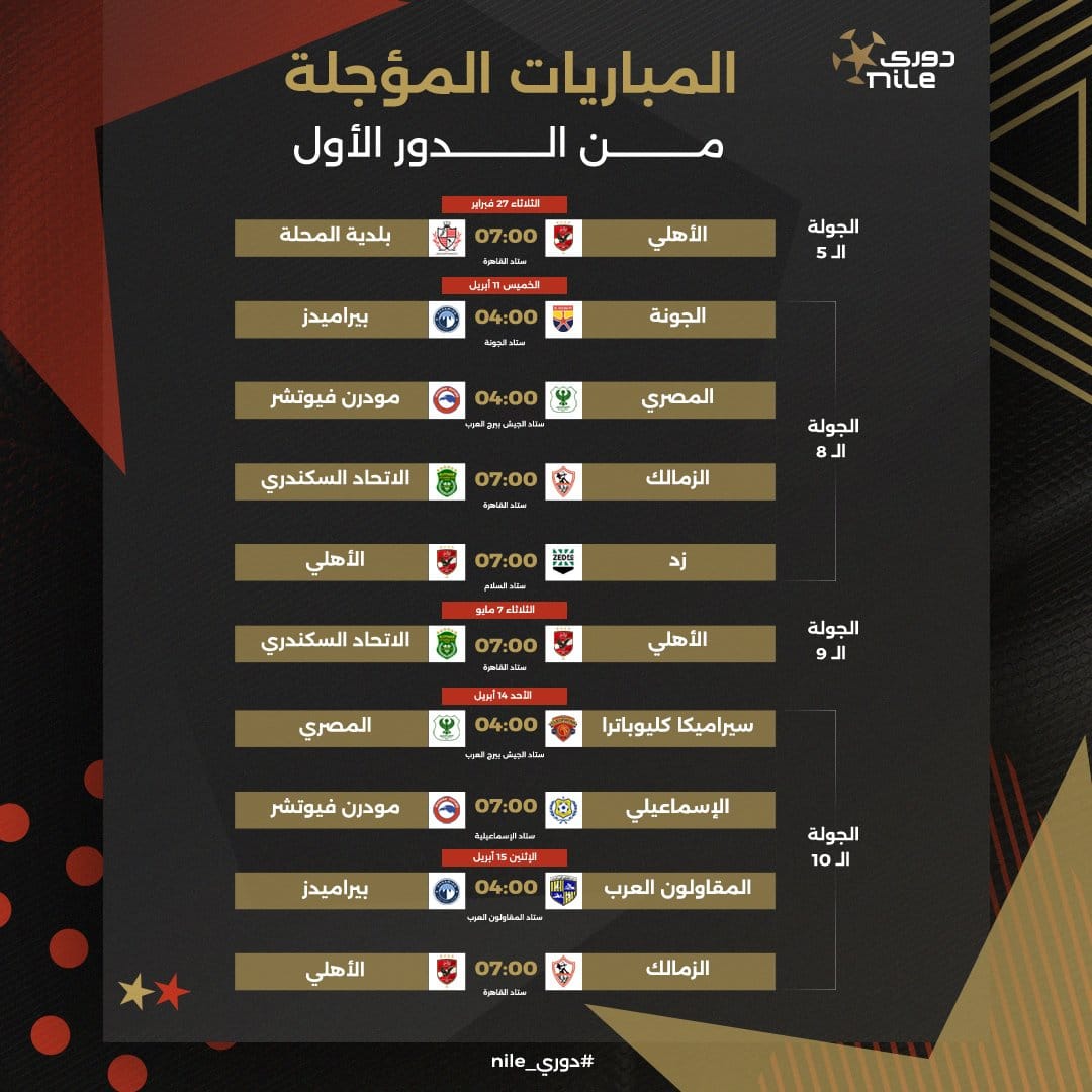 وحددت رابطة الأندية يوم 15 أبريل موعدًا لمباراة الزمالك والأهلي والمؤجلة من الجولة العاشرة لبطولة الدوري الممتاز، وبعد هذا الموعد بـ 4 أيام فقط وتحديدًا يوم 19 أبريل سيكون الزمالك على موعد مع مباراة أخرى من العيار الثقيل أمام فريق بيراميدز في إطار الجولة الـ 18 لبطولة الدوري.