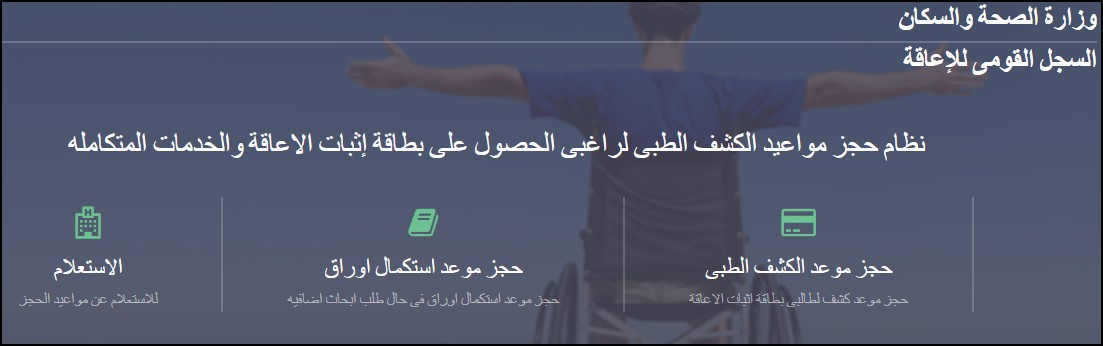 - الدخول على موقع وزارة الصحة السكان المخصص لحجز الكشف الطبي للمعاقين من هـــنــــا.