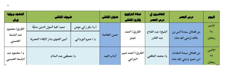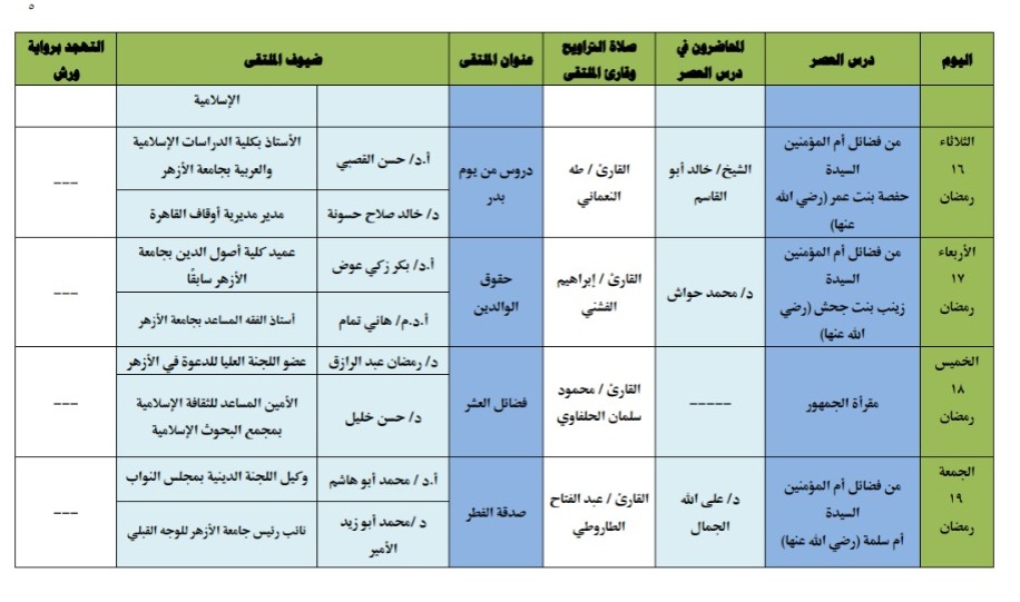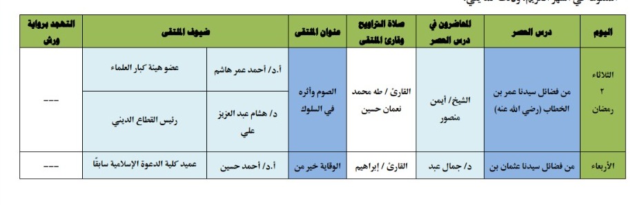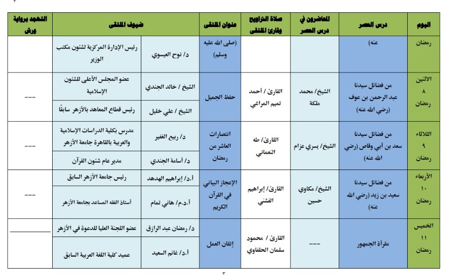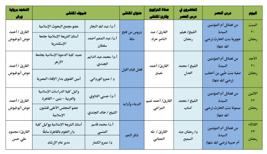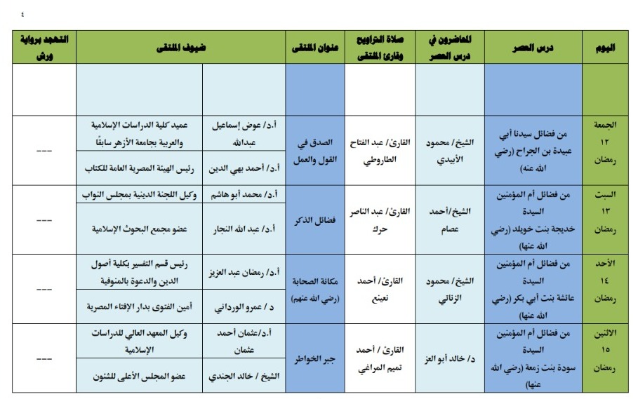 ونشرت وزارة الأوقاف نماذج بأسماء العلماء والقراء الذين سيحيون أيام وليالي شهر رمضان المبارك «1445هـ / 2024م» في مسجد الإمام الحسين «رضي الله عنه»، على أن تنشر تباعًا البرامج المتنوعة في الشهر الكريم، وذلك كما يلي: