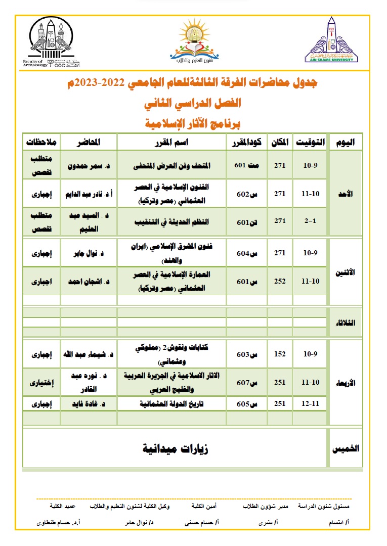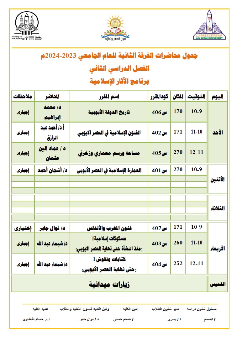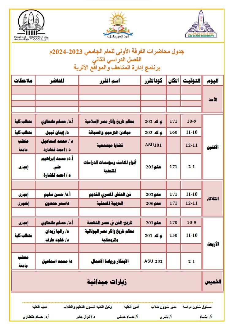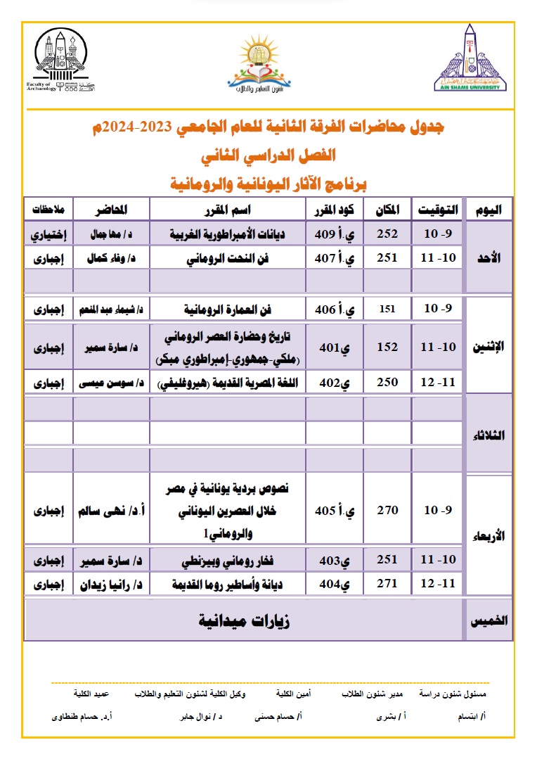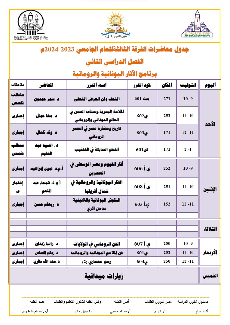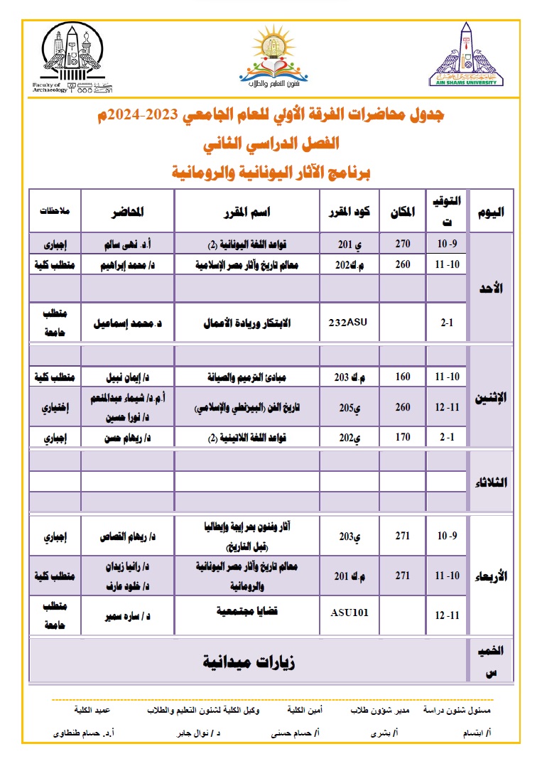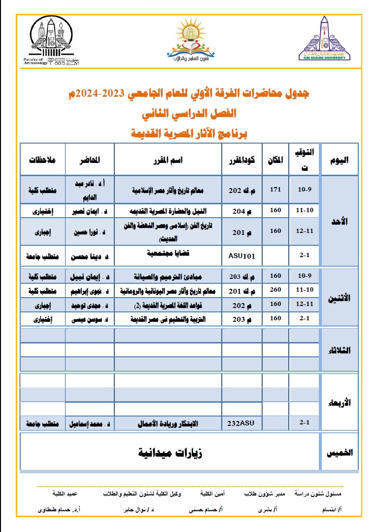 ونشرت كلية الآثار بـ جامعة عين شمس عبر صفحتها الرسمية على موقع التواصل الاجتماعي فيس بوك، جداول المحاضرات للطلاب خلال شهر رمضان المبارك ليكونوا على علم به، والتي جاءت على النحو التالي: