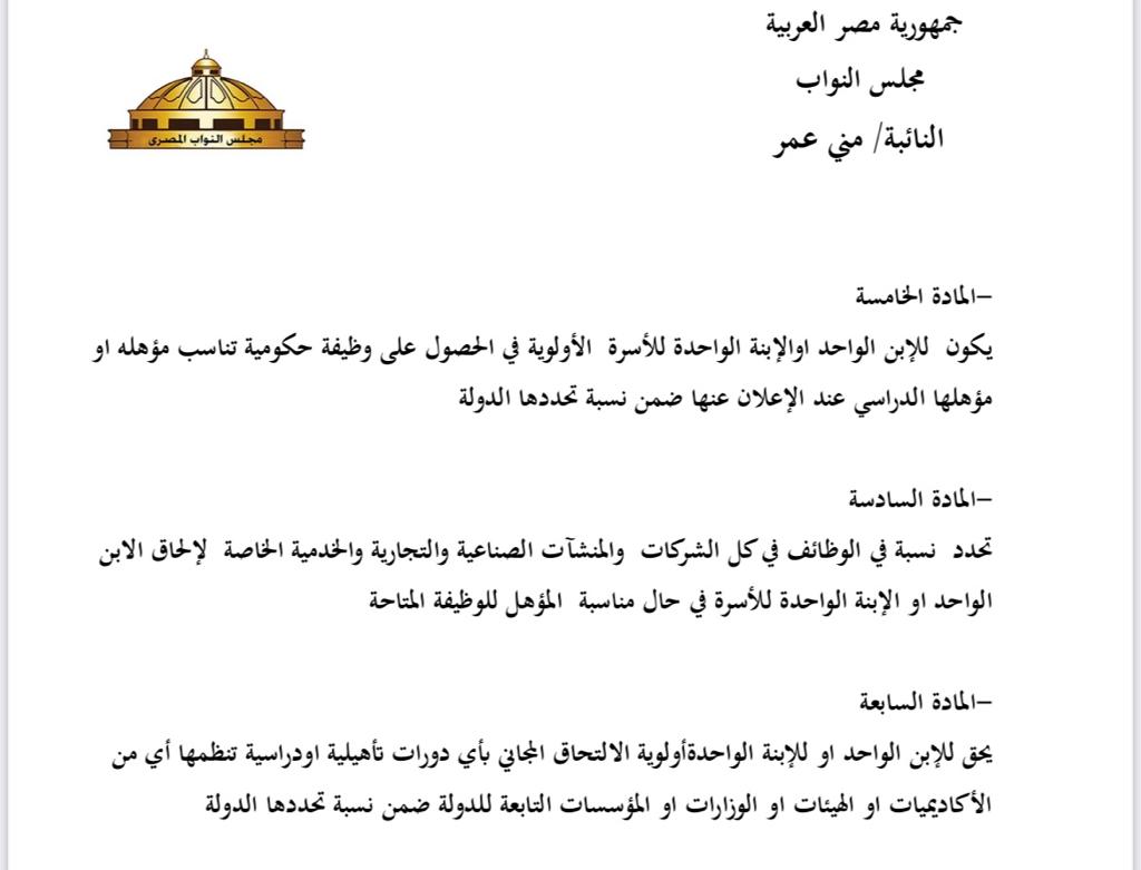 وتضمن مشروع القانون، أنه يحق للابن الواحد أو الابنة الواحدة أولوية الالتحاق المجاني بأي دورات تأهيلية أودراسية تنظمها أي من الأكاديميات أو الهيئات أو الوزارات، أو المؤسسات التابعة للدولة، ضمن نسبة تحددها الدولة.