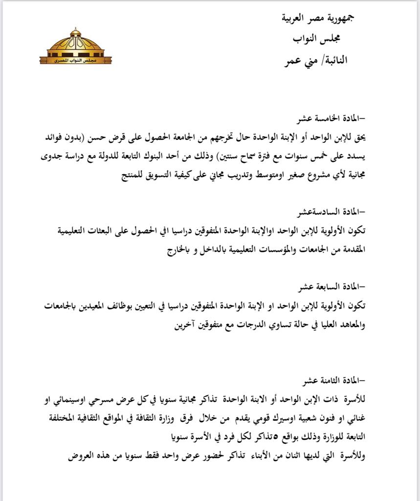 وحصل القاهرة 24 على أبرز مواد مشروع قانون تعظيم مكتسبات الأسرة قليلة العدد، حيث نصت المادة الخامسة في مشروع القانون على: أنه يحق لـ الابن الواحد أو الابنة الواحدة حال التخرج من الجامعة، الحصول على قرض حسن بدون فوائد، يسدد على 5 سنوات مع فترة سماح سنتين وذلك من أحد البنوك التابعة للدولة، مع دراسة جدوى مجانية لأي مشروع صغير أو متوسط وتدريب مجاني على كيفية التسويق للمنتج.
