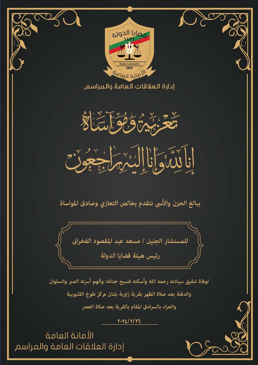 وتقدمت هيئة قضايا الدولة ببالغ الحزن والأسى وبخالص التعازي وصادق المواساة لرئيس الهيئة في وفاة شقيقه رحمه الله وأسكنه فسيح جناته وألهم أسرته الصبر والسلوان.
