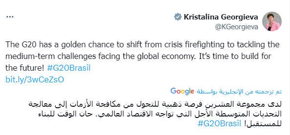 وعبر حسابها على موقع إكس تويتر سابقا قالت مديرة صندوق النقد الدولي: إن لدى مجموعة العشرين فرصة ذهبية للتحول من مكافحة الأزمات إلى معالجة التحديات المتوسطة الأجل التي تواجه الاقتصاد العالمي.. وتابعت: حان الوقت للبناء للمستقبل.
