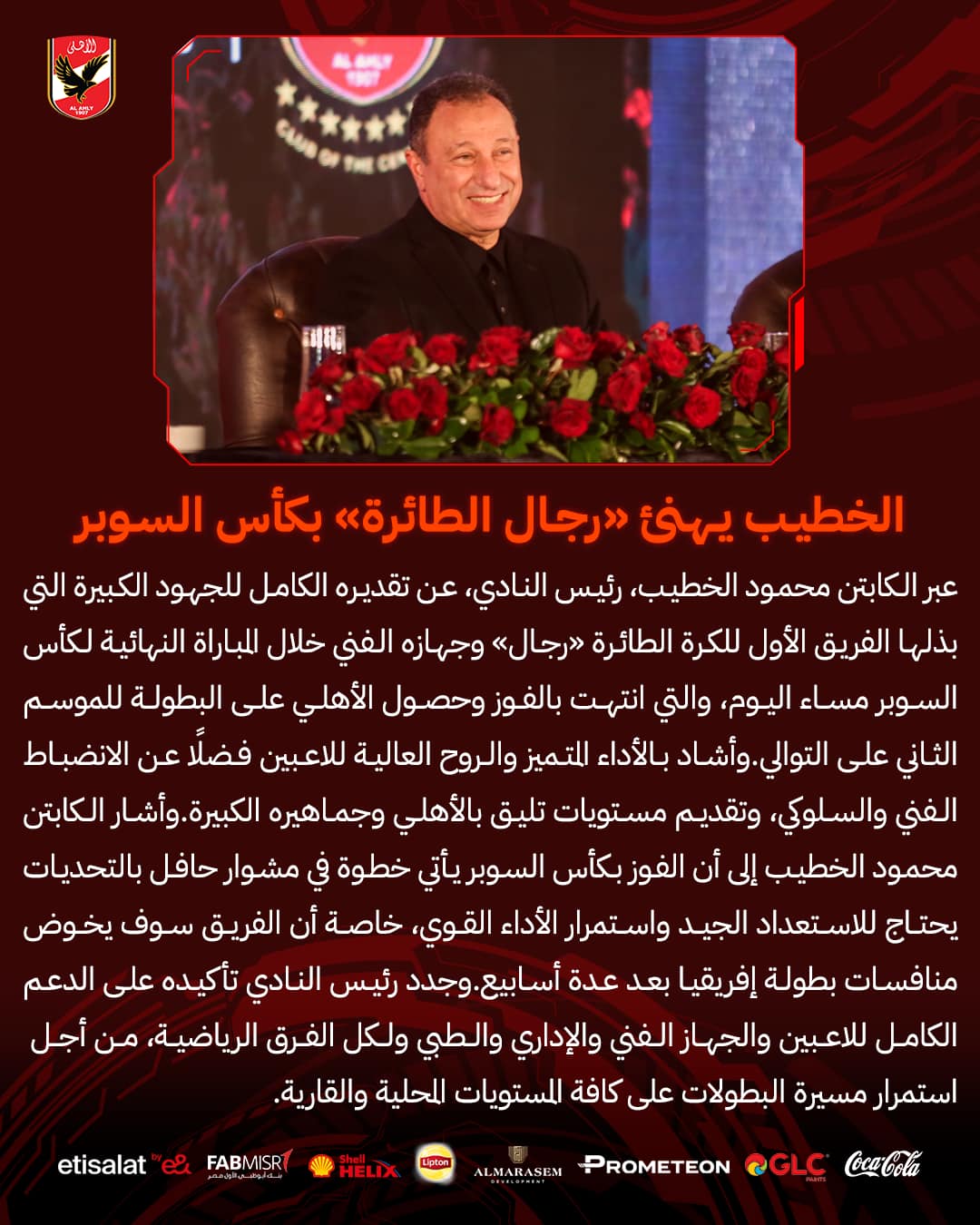 الخطيب يهنئ فريق طائرة الأهلي رجال بالتتوج بكأس السوبر