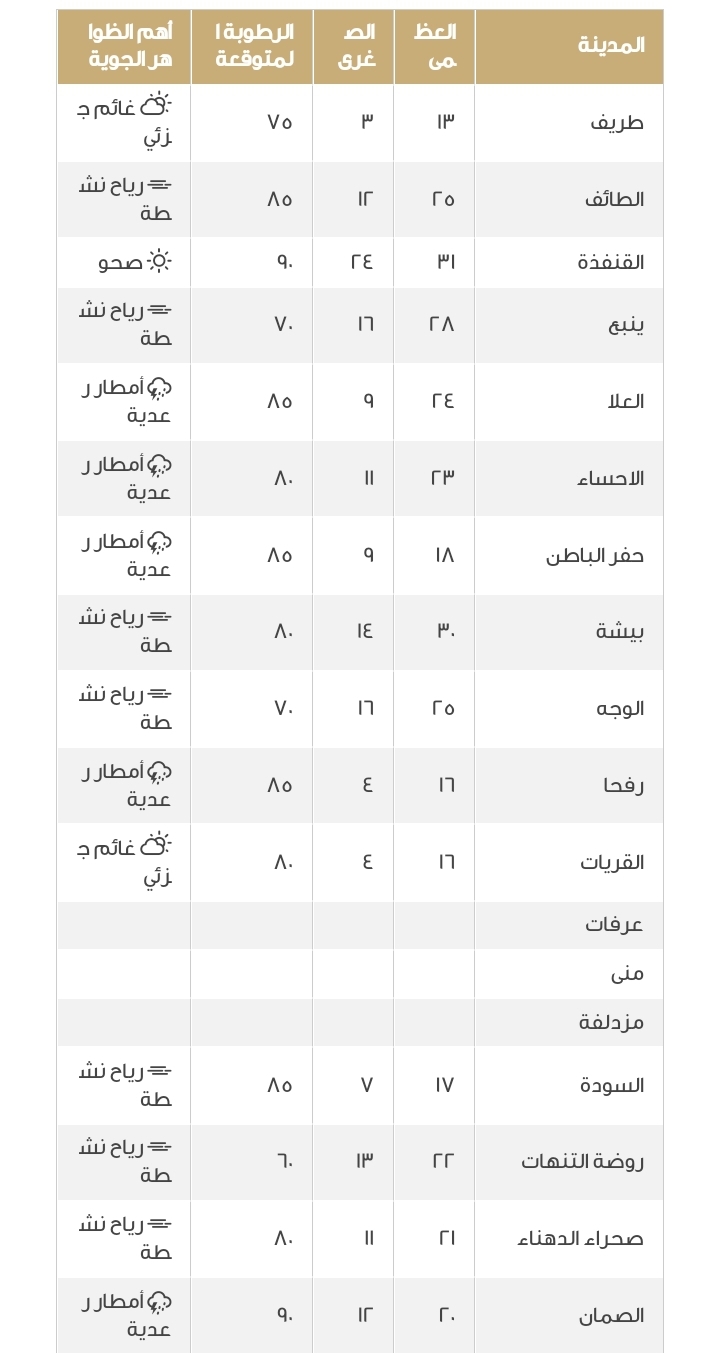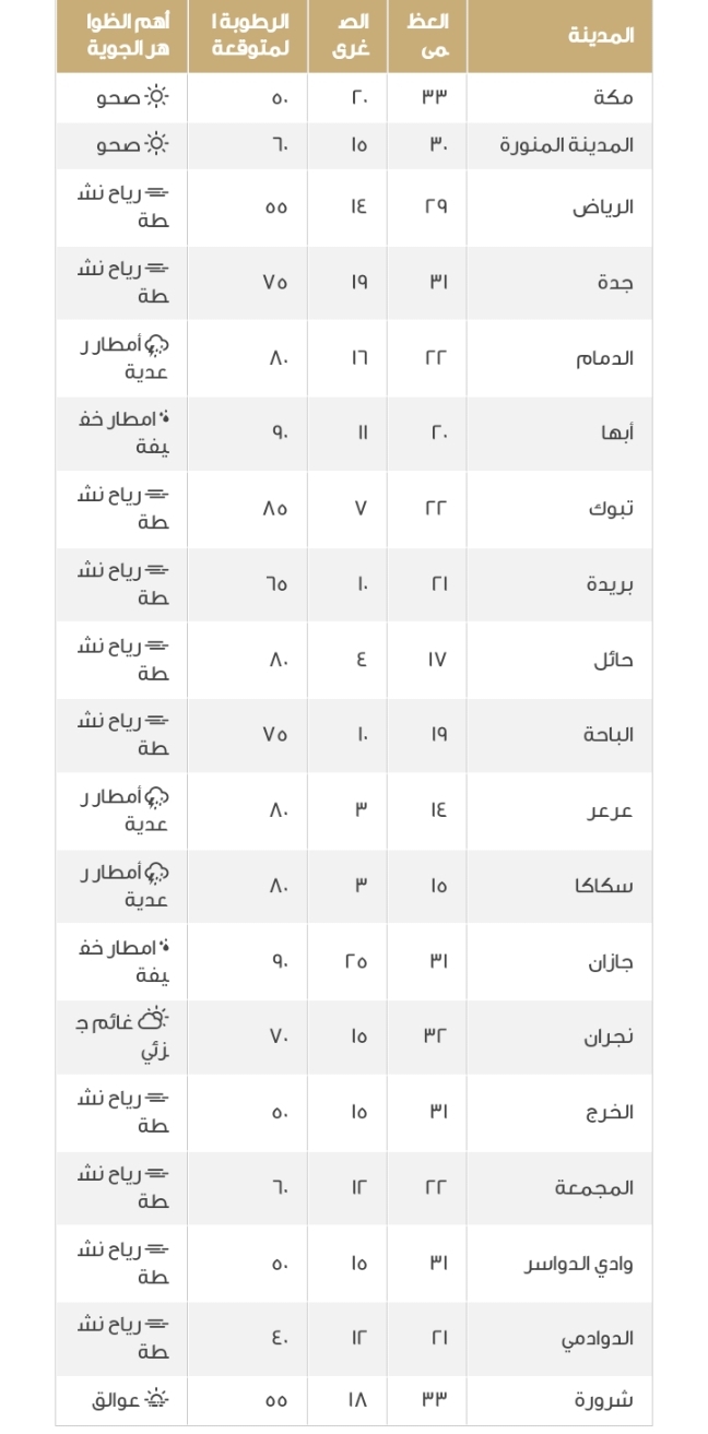 ويبين الجدول التالي درجات الحرارة العظمى والصغرى في مدن المملكة، ونسبة الرطوبة بالدرجة المئوية وأبرز الظواهر الجوية:
