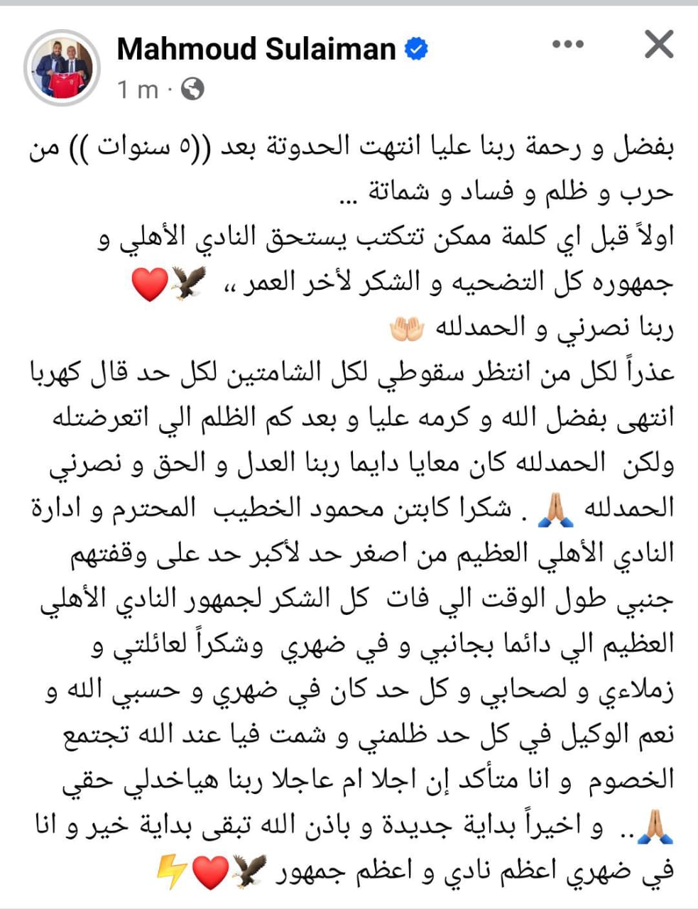وأضاف في منشوره: كل الشكر لجمهور النادي الأهلي العظيم اللي دائما بجانبي وفي ضهري وشكرًا لعائلتي وزملائي ولصحابي وكل حد كان في ضهري وحسبي الله ونعم الوكيل في كل حد ظلمني وشمت فيا عند الله تجتمع الخصوم، وأنا متأكد إن آجلا أم عاجلا ربنا هياخدلي حقي، وأخيرًا بداية جديدة وبإذن الله تبقى بداية خير وأنا في ضهري أعظم نادي وأعظم جمهور.