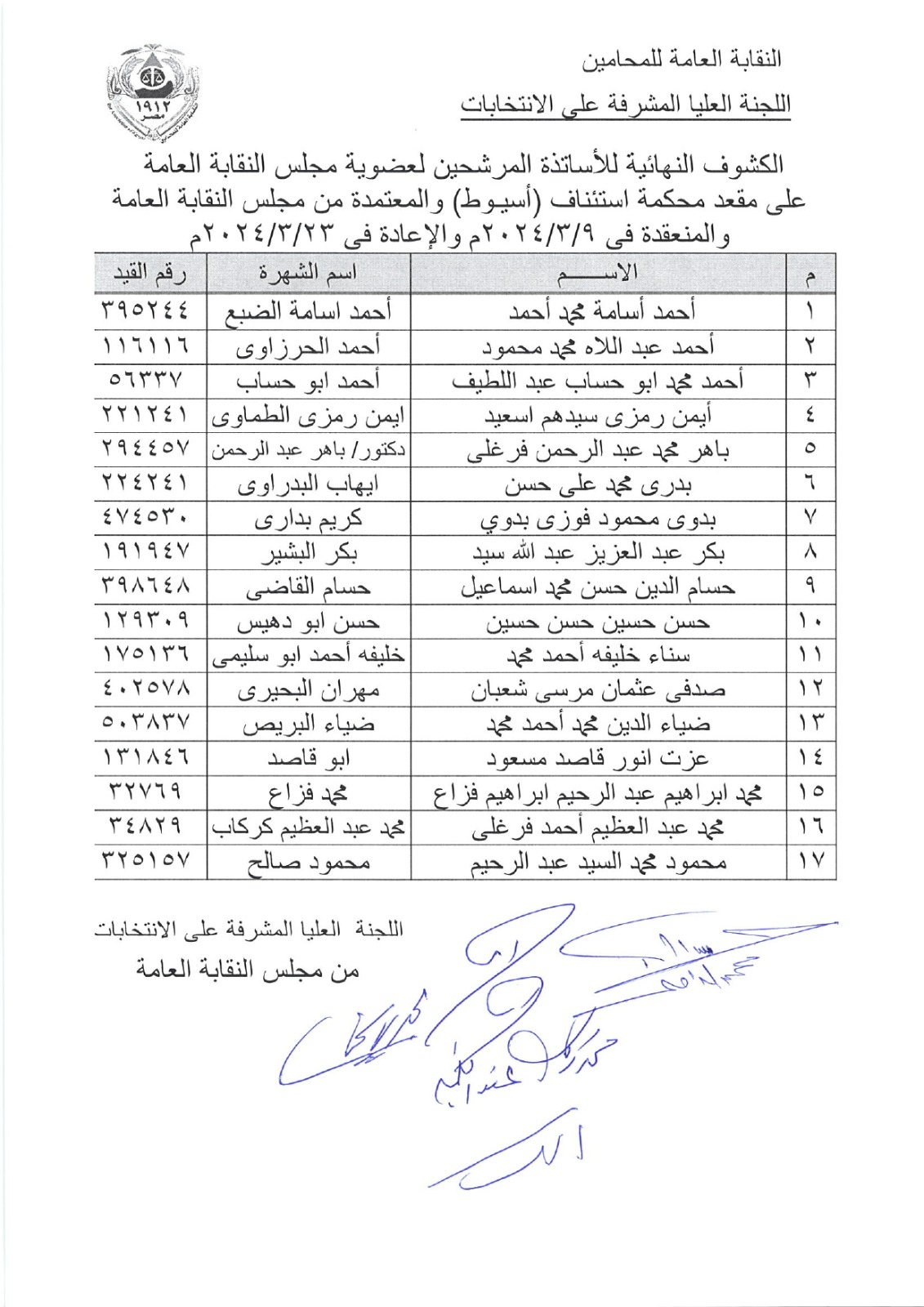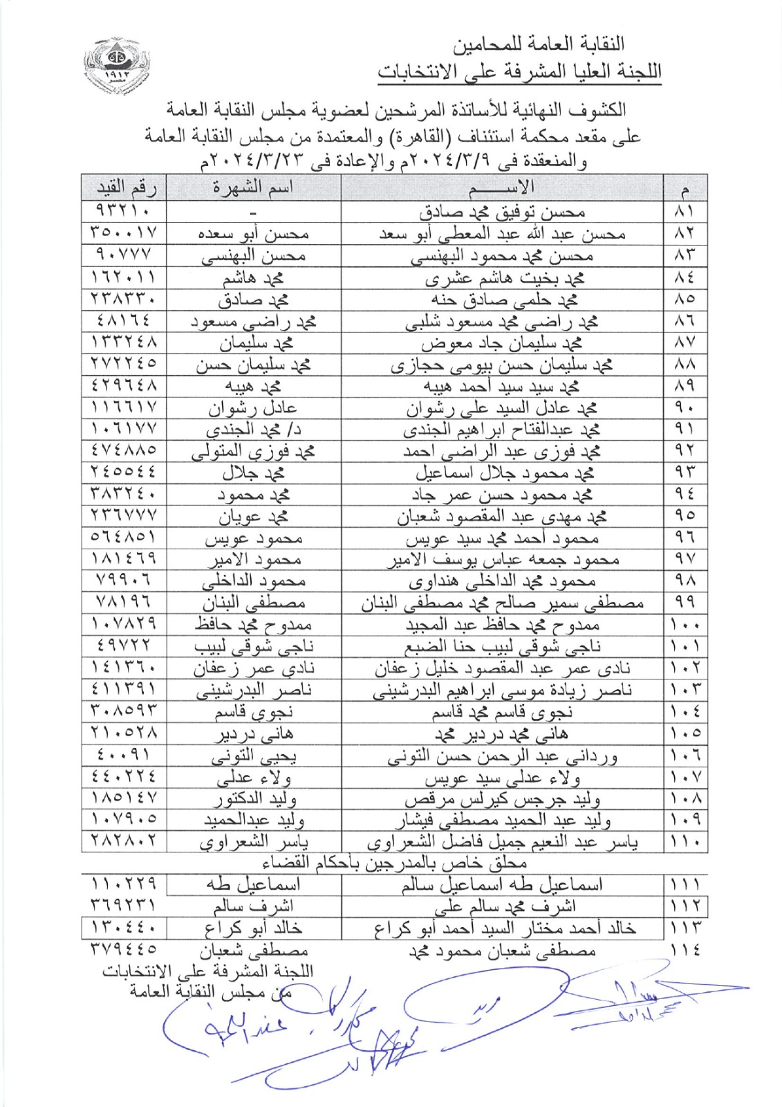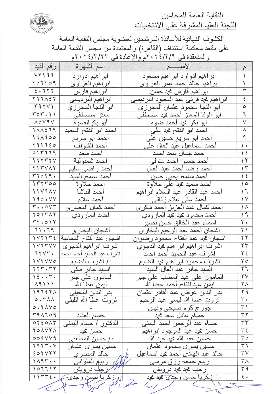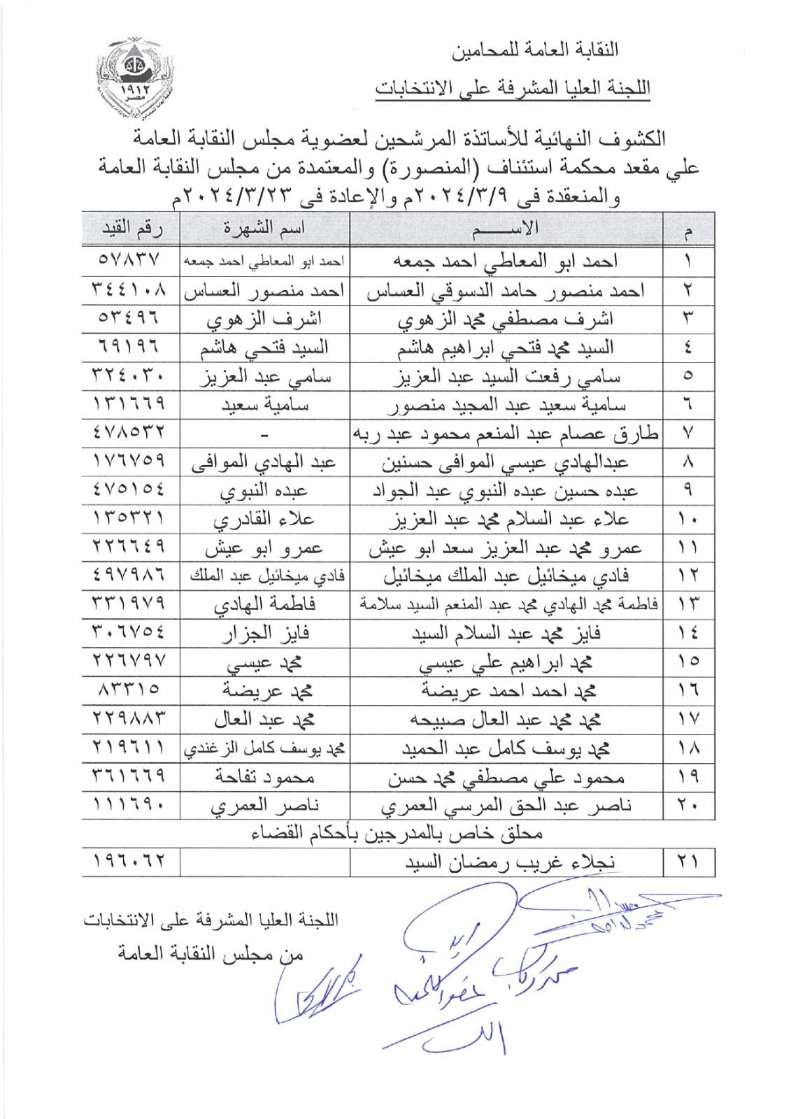 أعلنت اللجنة العليا المشرفة على انتخابات نقابة المحامين، عن الكشوف النهائية للمرشحين على منصب النقيب العام، والمرشحين على عضوية المجلس، والمعتمدة من مجلس النقابة العامة.