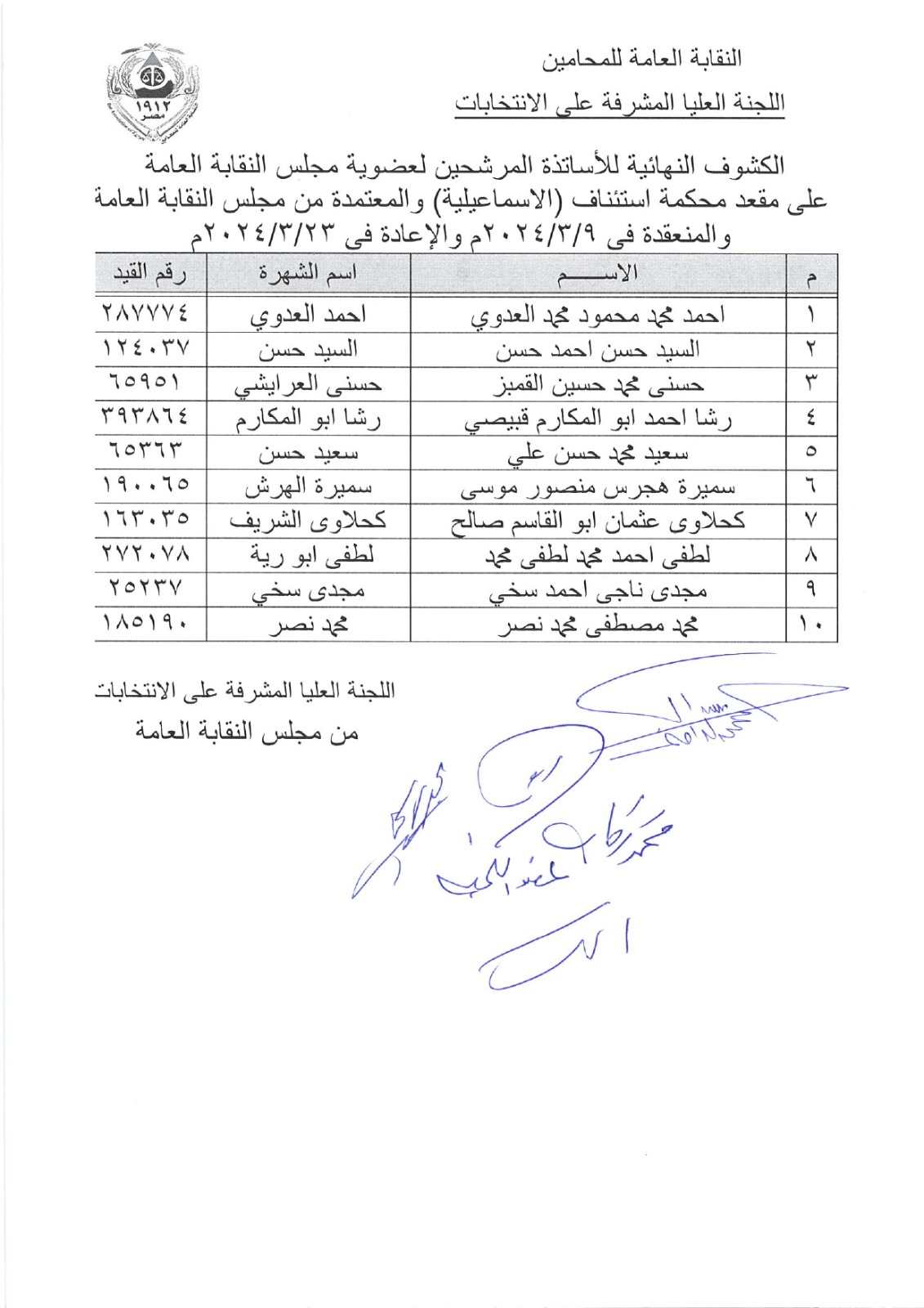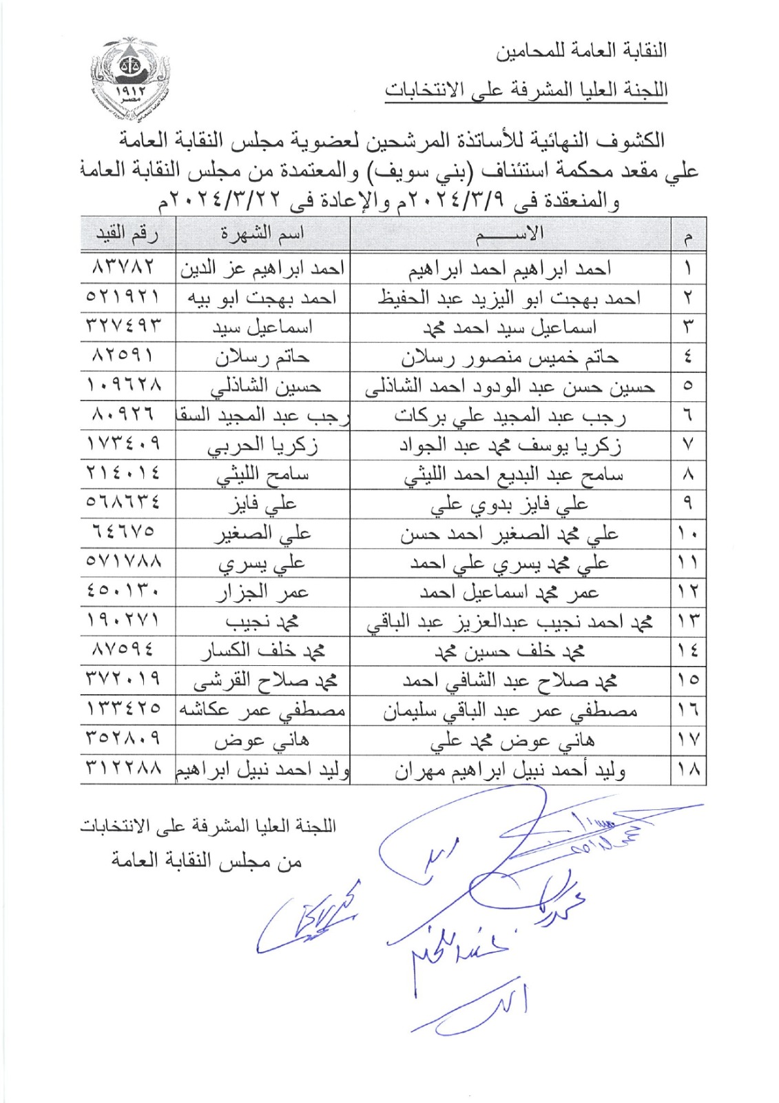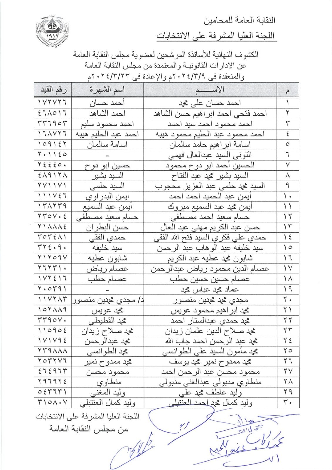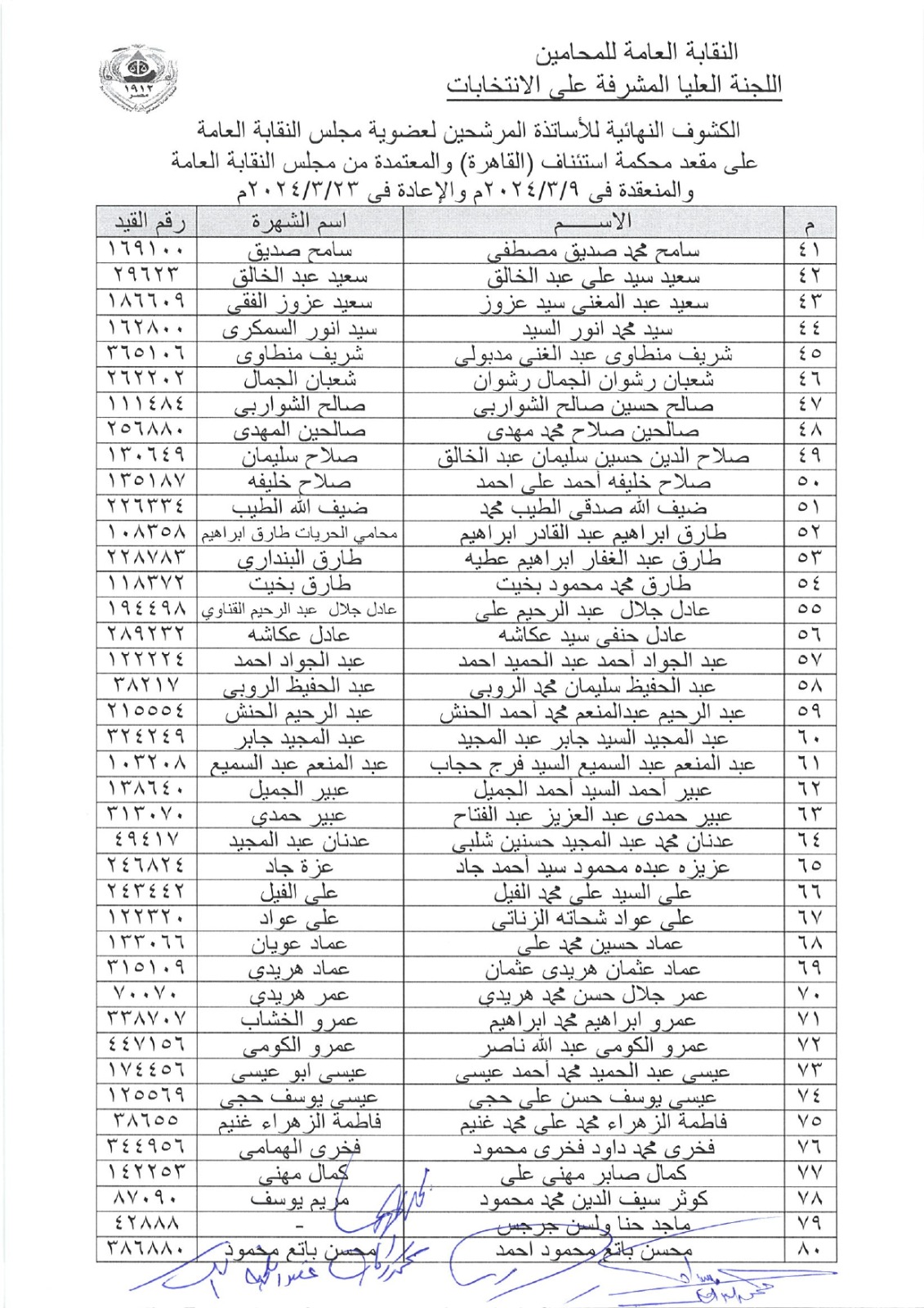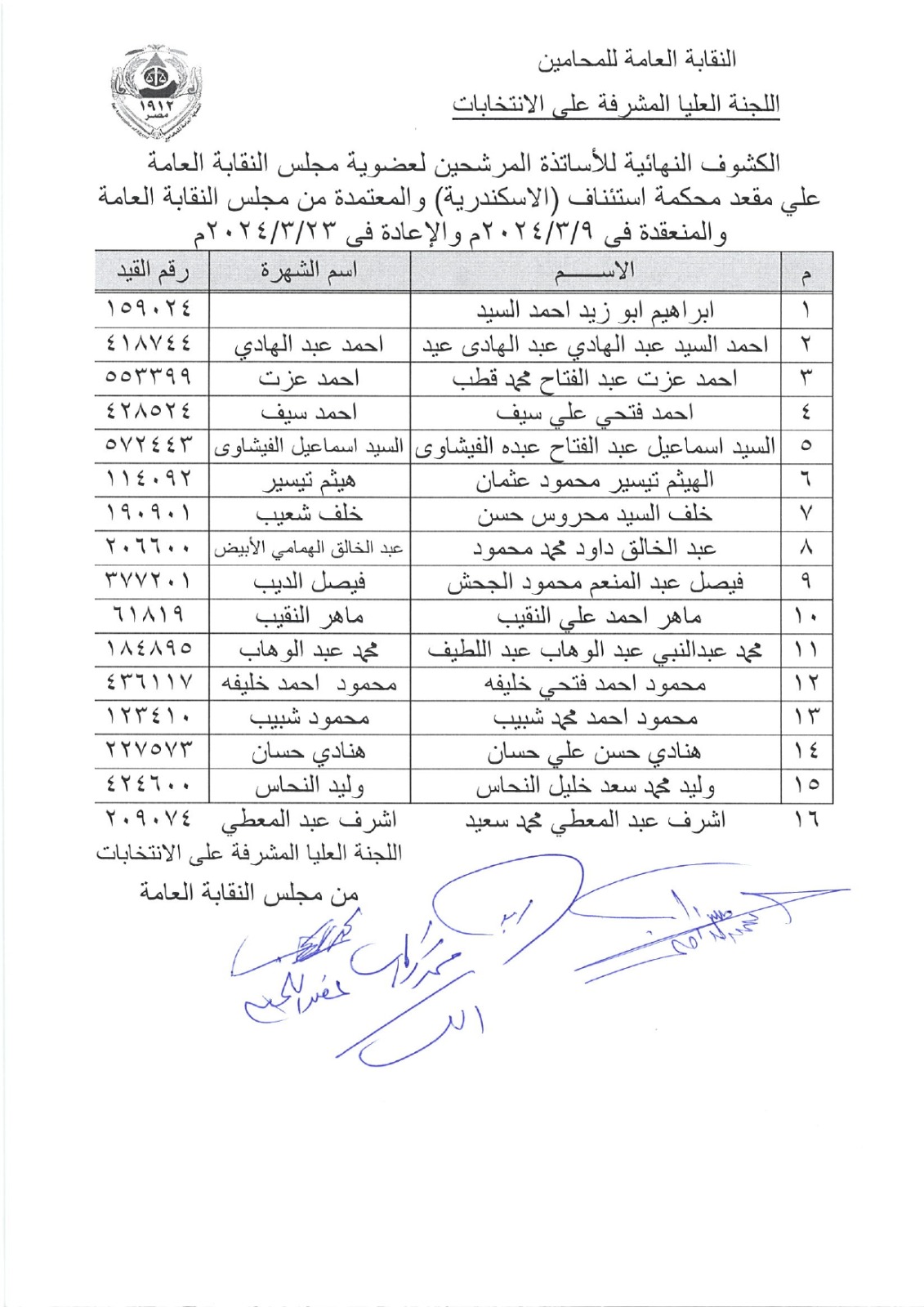 أعلنت اللجنة العليا المشرفة على انتخابات نقابة المحامين، عن الكشوف النهائية للمرشحين على منصب النقيب العام، والمرشحين على عضوية المجلس، والمعتمدة من مجلس النقابة العامة.