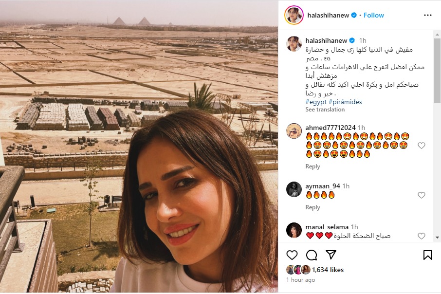 ونشرت حلا شيحة صورة تجمعها بالأهرامات، عبر حسابها الرسمي بموقع انستجرام، وعلقت: مفيش في الدنيا كلها زي جمال وحضارة مصر، ممكن أفضل اتفرج على الأهرامات ساعات ومزهقش أبدا، صباحكم أمل وبكرة أحلى أكيد.. كله تفاؤل وخير ورضا.