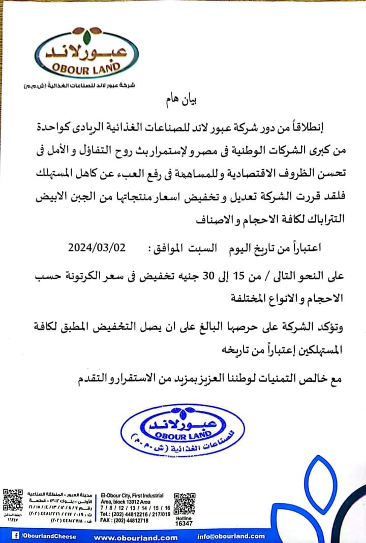 قررت شركة عبور لاند للصناعات الغذائية ومنتجات الألبان، تخفيض أسعار منتجاتها حسب الأحجام والأنواع المختلفة، اعتبارا من اليوم السبت 2 مارس 2024.