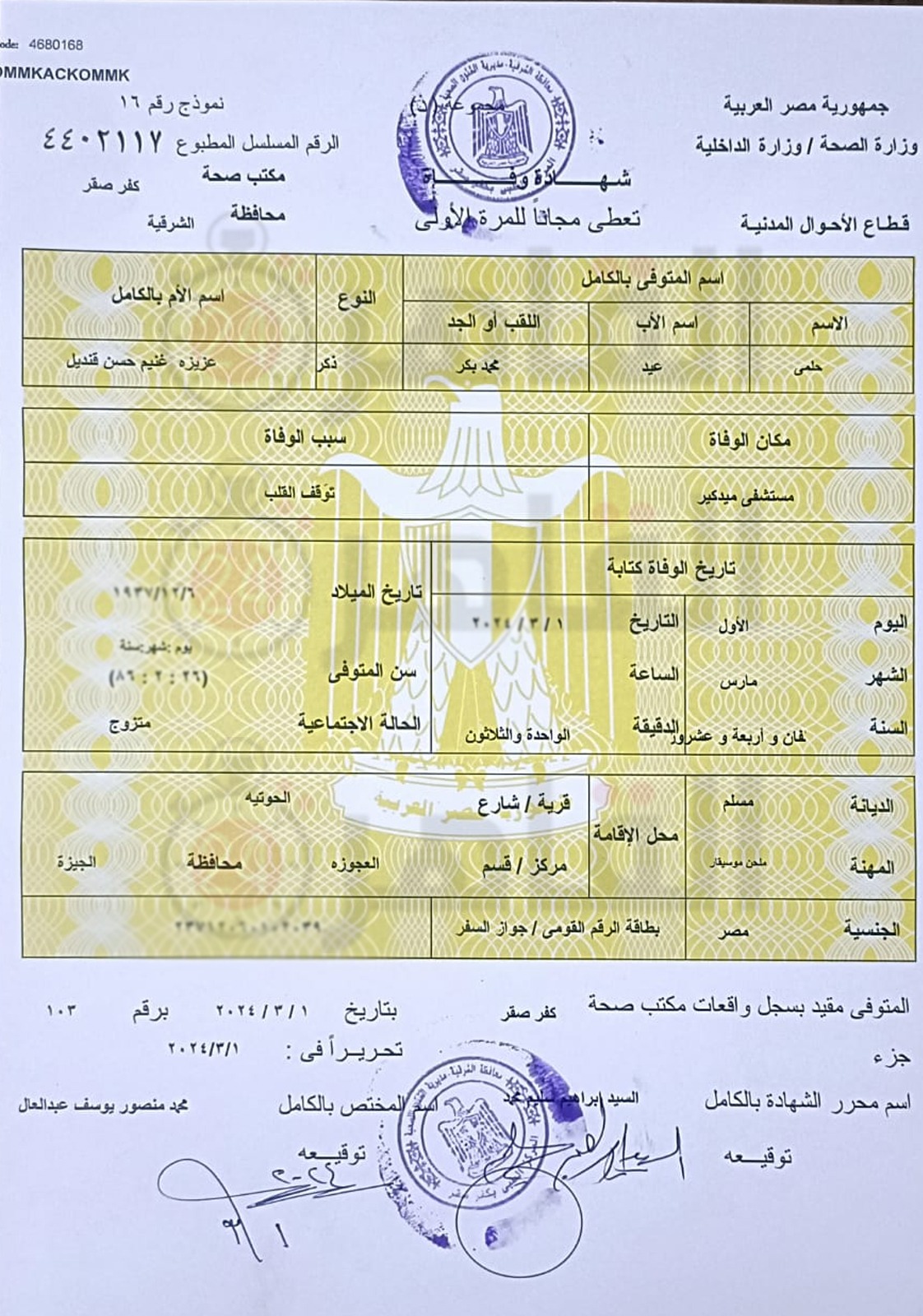 لا شبهة جنائية.. ننشر شهادة الوفاة وتصريح الدفن لحلمي بكر | خاص