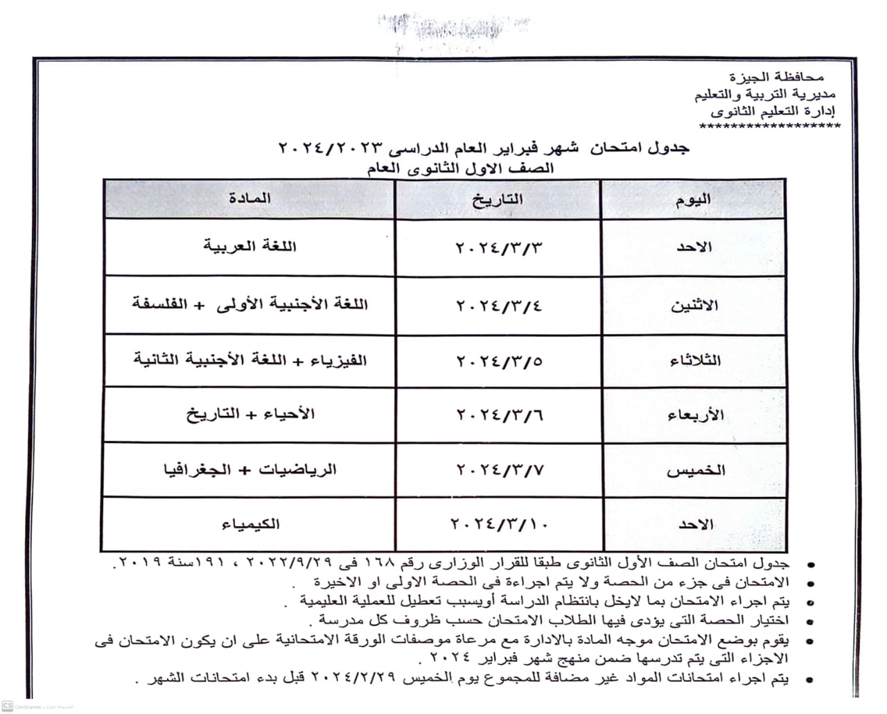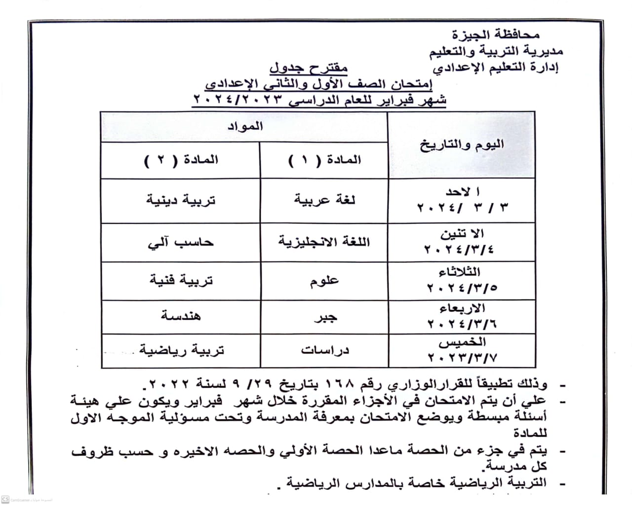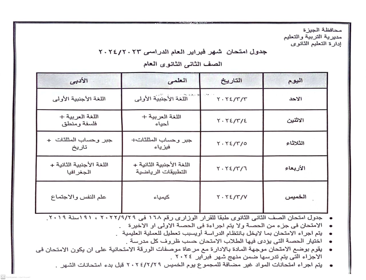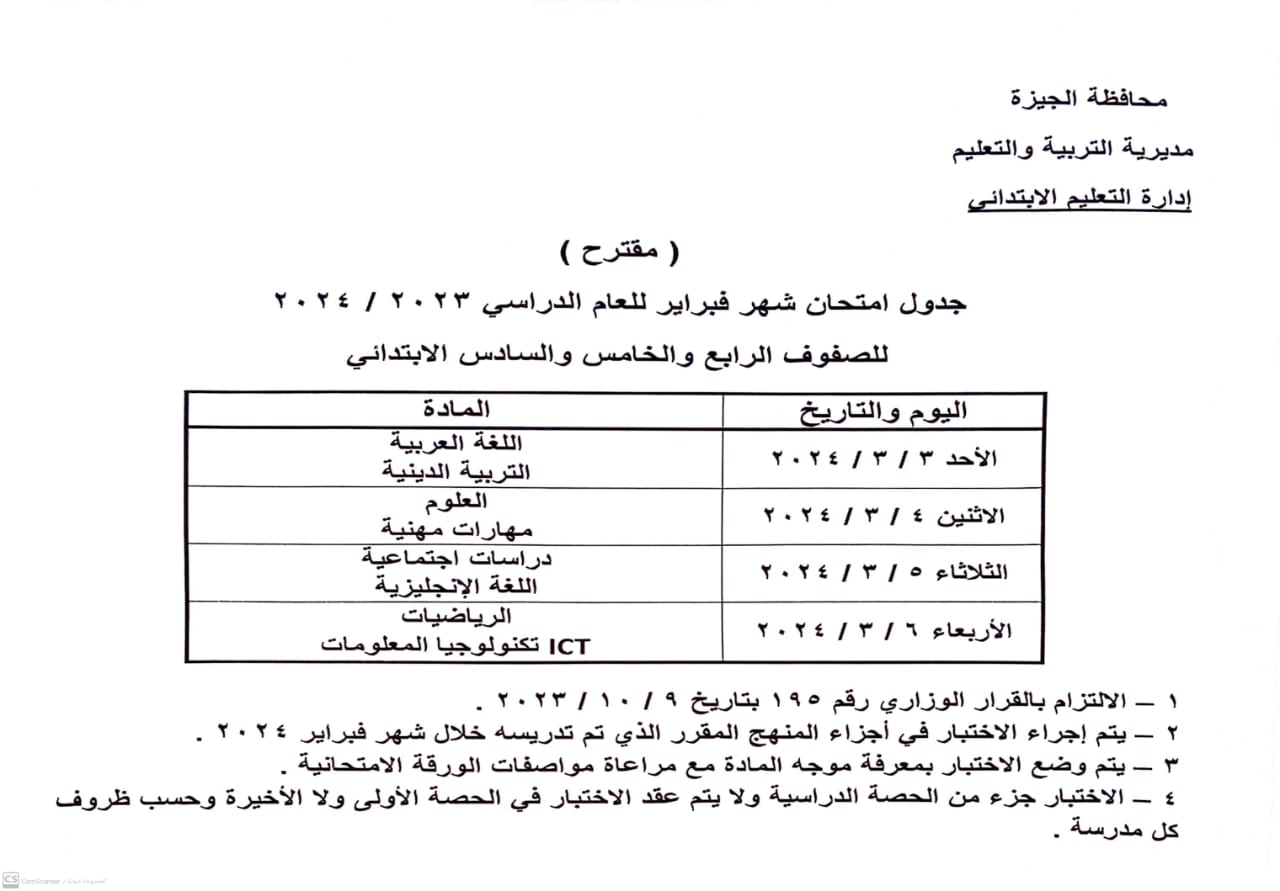 جدول امتحانات شهر فبراير 2024 بالجيزة
