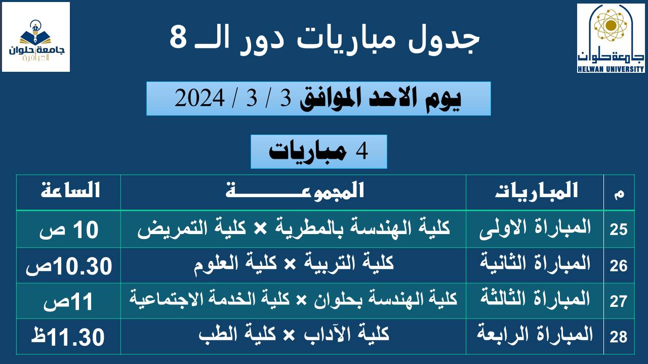 وقالت جامعة حلوان في بيان اليوم الأحد، أن مباريات دور الثمانية تستكمل اليوم وتقام المباريات النهائية يومي الإثنين والثلاثاء الموافق 4:5 مارس الجاري وحفل ختام المسابقة، حيث تعقد فعاليات المسابقة تحت رعاية ودعم الدكتور السيد قنديل رئيس الجامعة، الدكتور حسام رفاعي نائب رئيس الجامعة لشئون التعليم والطلاب، الدكتور احمد عليق مستشار رئيس الجامعة للأنشطة الطلابية.