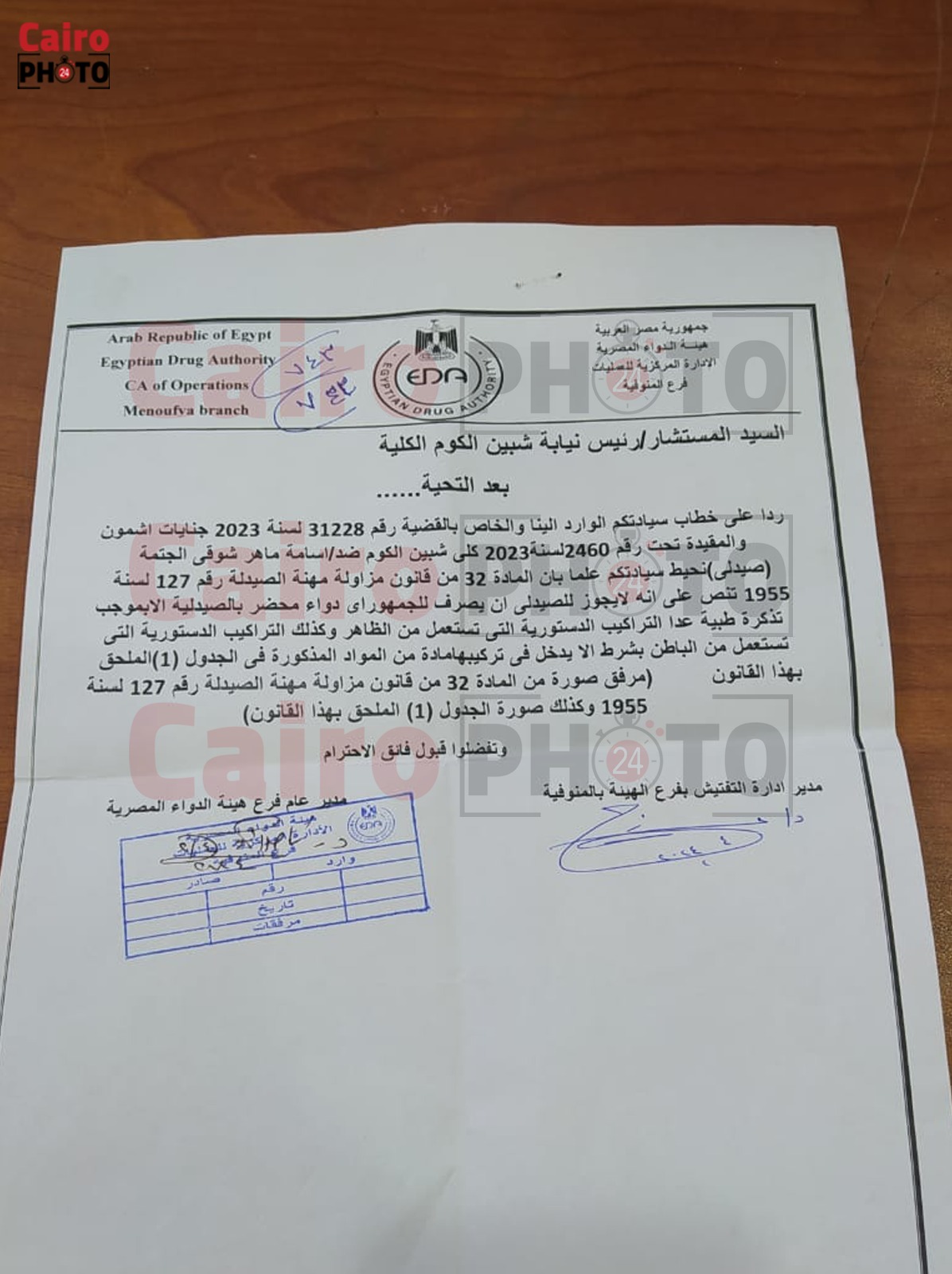 قدم محامي أسرة العامل المتوفى بعد حقنة أخذها في صيدلية بالمنوفية، مستندات تدل على عدم أحقية الصيدلي المتهم بوصف وإعطاء الدواء طبقا لخطاب من هيئة الدواء المصرية.