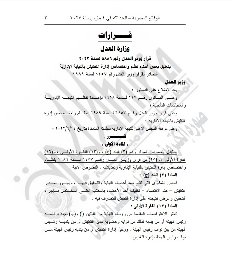 وجاء القرار: بعد الاطلاع على الدستور وعلى القانون رقم 117 لسنة 1958 بإعادة تنظيم النيابة الإدارية، والمحاكمات التأديبية ؛ وعلى قرار وزير العدل رقم 6457 لسنة 1989بنظام واختصاص إدارة التفتيش بالنيابة الإدارية ؛ وعلى موافقة المجلس الأعلى للنيابة الإدارية بجلسته المنعقدة بتاريخ 2022/9/14 ؛ يستبدل بنصوص المواد أرقام3 البند (ج)، و13 الفقرة الأولى، و16، و25 من الفقرة الأولى قرار وزير العدل رقم 6457 لسنة 1989 بنظام واختصاص إدارة التفتيش بالنيابة الإدارية وتعديلاته.