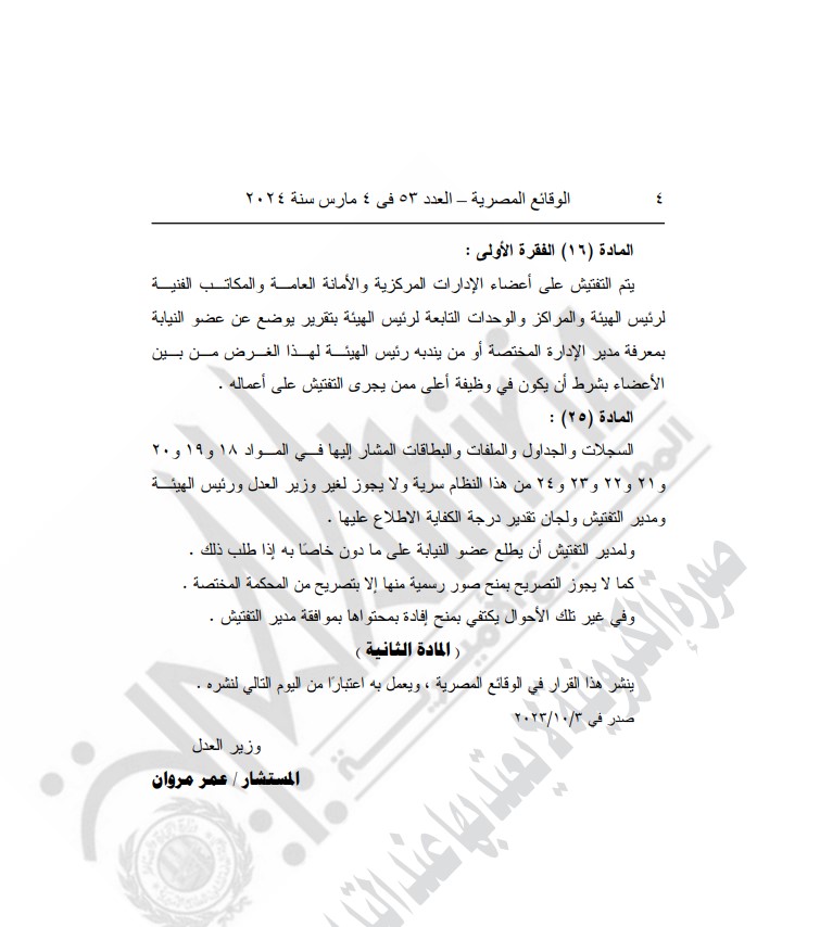 كما في المادة 16الفقرة الأولى يتم التفتيش على أعضاء الإدارات المركزية والأمانة العامة والمكاتب الفنية لرئيس الهيئة والمراكز والوحدات التابعة لرئيس الهيئة بتقرير يوضع عن عضو النيابة بمعرفة مدير الإدارة المختصة أو من يندبه رئيس الهيئة لهذا الغرض من بين الأعضاء بشرط أن يكون في وظيفة أعلى ممن يجرى التفتيش على أعماله.