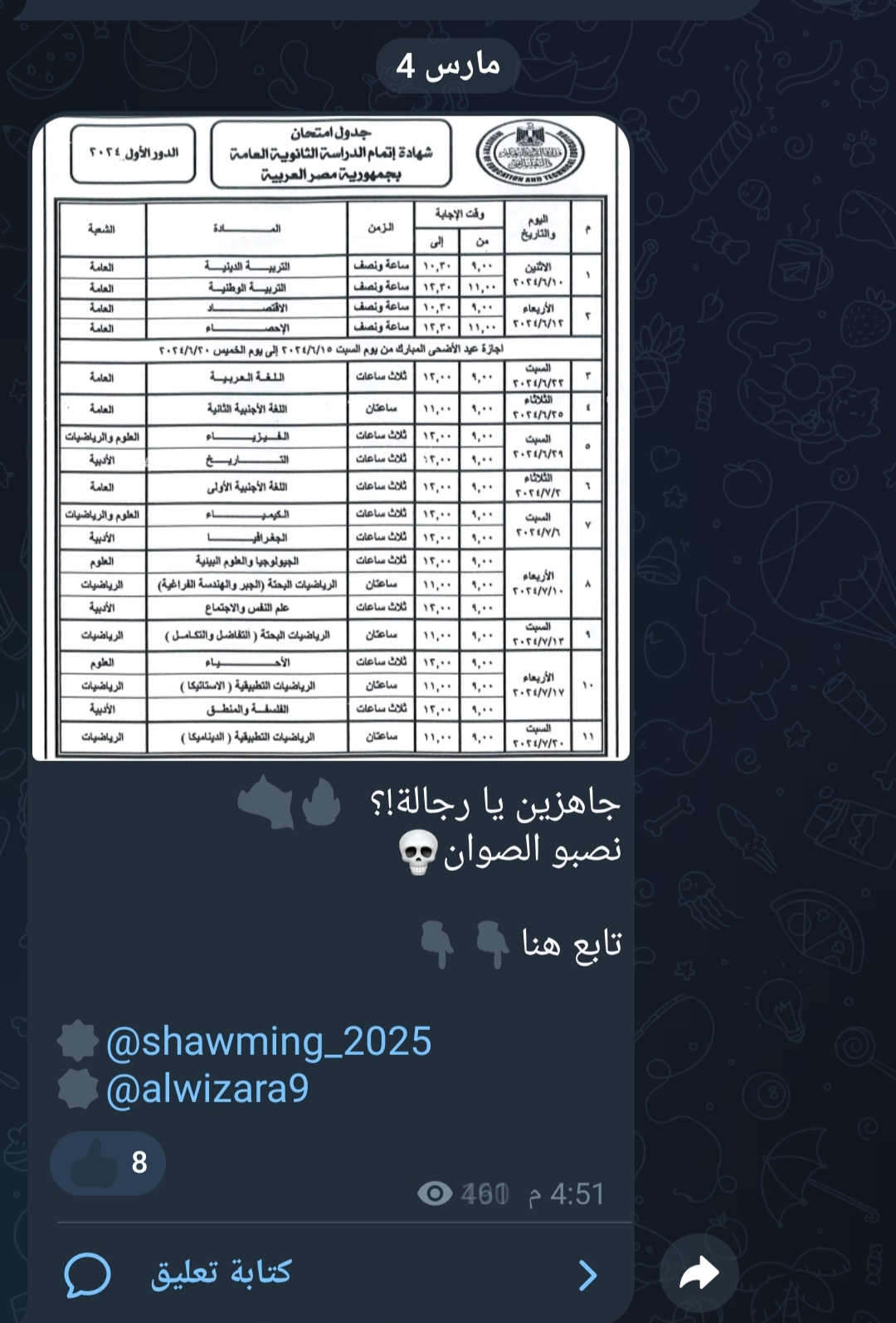 وقال أدمن جروب شاومينج عبر تطبيق تليجرام لطلاب الثانوية العامة 2024: جاهزين يا رجالة؟.. نصبوا الصوان.