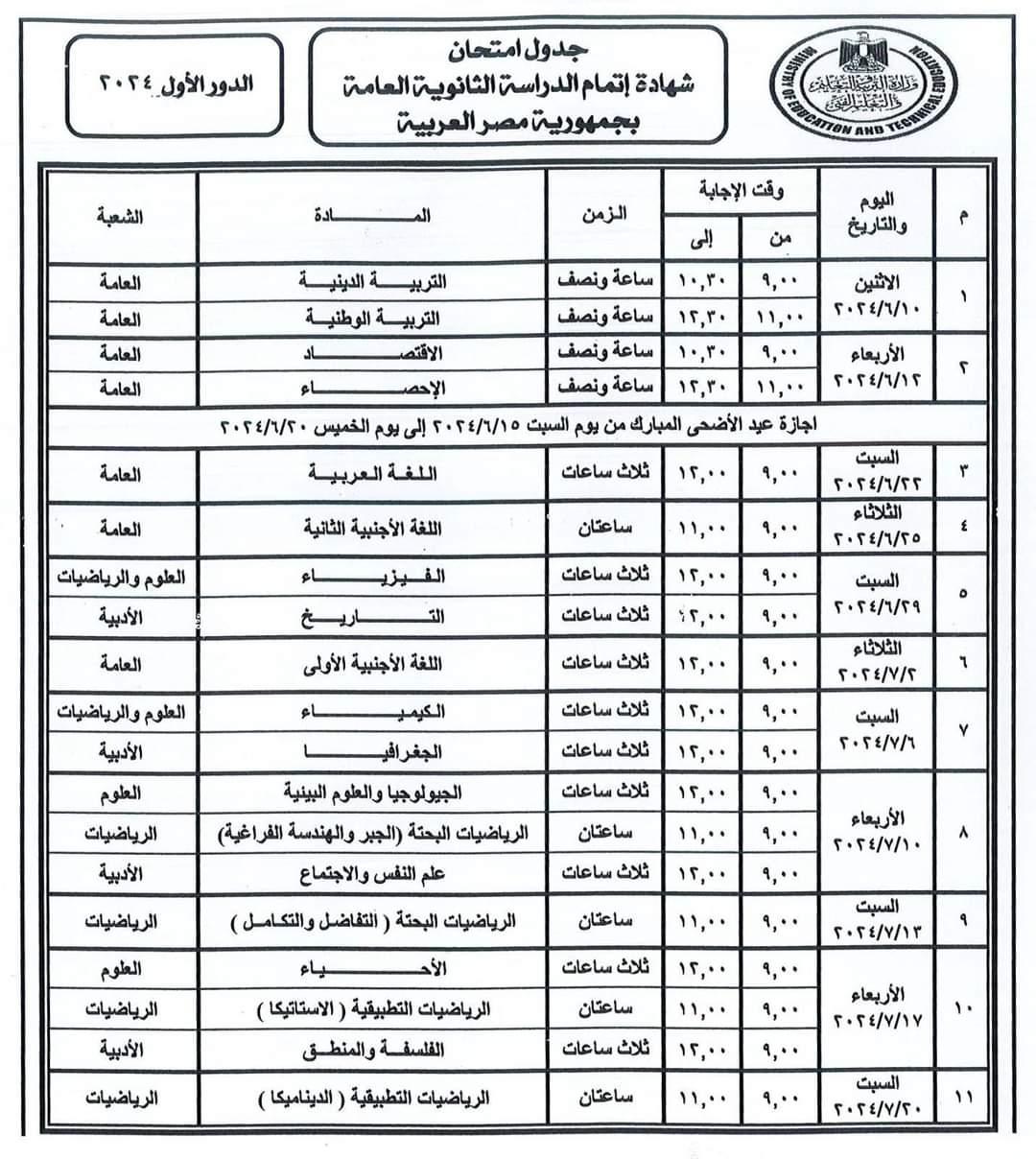 وأعلنت وزارة التربية والتعليم والتعليم الفني، منذ قليل، جدول امتحانات الثانوية العامة 2024، بعد اعتماده من قبل الدكتور رضا حجازي.
