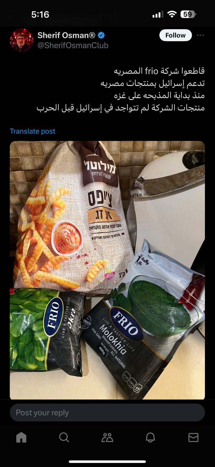 وتداول عدد كبير من مستخدمي وسائل التواصل الاجتماعي صورا تظهر وجود منتجات لشركة أحمد تي لصناعة الشاي، لدى كيان الاحتلال الإسرائيلي وأيضا منتجات لشركة فاريو للصناعات الغذائية من الملوخية المجمدة والبازلاء والفاصوليا.