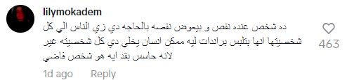 وعقبت أيضًا: هي مش بتتحسب بعربية ولا تليفون.. شكل.. شعر.. لون، مما دفعها لتوضيح الأمر عما يفعلونه الشباب بينهم وبين بعض خلال ممارسة التنمر بالتعليقات السلبية على المظاهر.