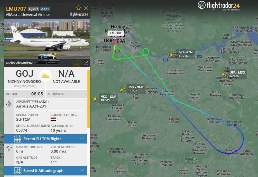 هبطت الطائرة التابعة للشركة المصرية إيرباص A-321، بمطار تشكالوف في نيجني نوفغورود الروسي، بعد نحو ساعة من إقلاعها من ذات المطار متجهة إلى شرم الشيخ.