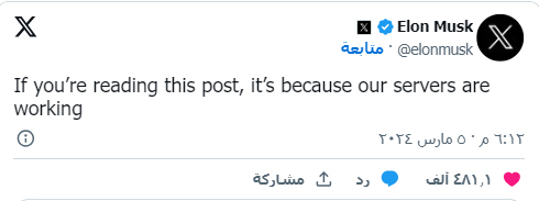 ونشر إيلون ماسك عبر حسابه الشخصي على منصة إكس (تويتر سابقا)، قائلًا: إذا كنت تقرأ هذا المنشور فذلك دليل أن خوادمنا تعمل.