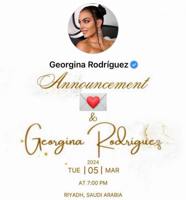 والدليل على أنه لا يوجد حفل زفاف كريستيانو رونالدو وجورجينا، هو أنه بعد أن نشرت رودريجيز ستوري على حسابها بإنستجرام، مرفق به بطاقة دعوة تشبه إلى حد كبير دعوة زفاف، كان اسم جورجينا رودريجيز ظاهرًا على البطاقة، لكن اسم رونالدو تم حجبه بذكاء باستخدام قلب، وكان تاريخ الدعوة هو 5 مارس 2024، والمكان الرياض، المملكة العربية السعودية.
