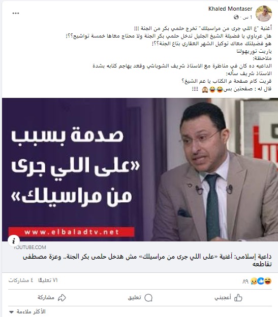 وكتب خالد منتصر على موقع فيس بوك: أغنية ع اللي جرى من مراسيلك تخرج حلمي بكر من الجنة! هل عرباوي يا فضيلة الشيخ الجليل تدخل حلمي بكر الجنة ولا محتاج معاها خمسة تواشيح؟! هو فضيلتك معاك توكيل الشهر العقاري بتاع الجنة؟ ياريت توريهولنا.