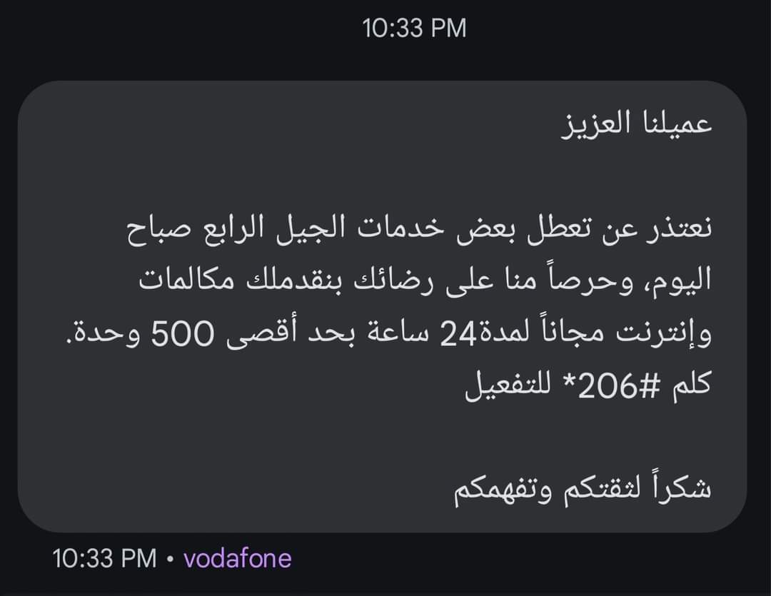 أعلنت شركة فودافون مصر، منح عملائها المتضررين من صعوبات تشغيل بعض خدمات الجيل الرابع نتيجة تحديثات لإحدى مكونات الشبكة تمت صباح اليوم، مكالمات وإنترنت مجانا لمدة 24 ساعة بحد أقصى 500 وحدة من خلال *206#.