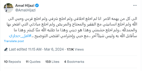 وكتبت أمل حجازي، منشورًا عبر حسابها الشخصي بموقع التغريدات القصيرة انستجرام، وقالت: إلى كل من يهمه الأمر أنا لم أخلع أخلاقي ولم أخلع شرفي ولم أخلع قربي وحبي إلى الله ولم أخلع إنسانيتي مع الفقير والمحتاج والمريض ولم أخلع مبادئي التي افتخر بها والحمد لله.
