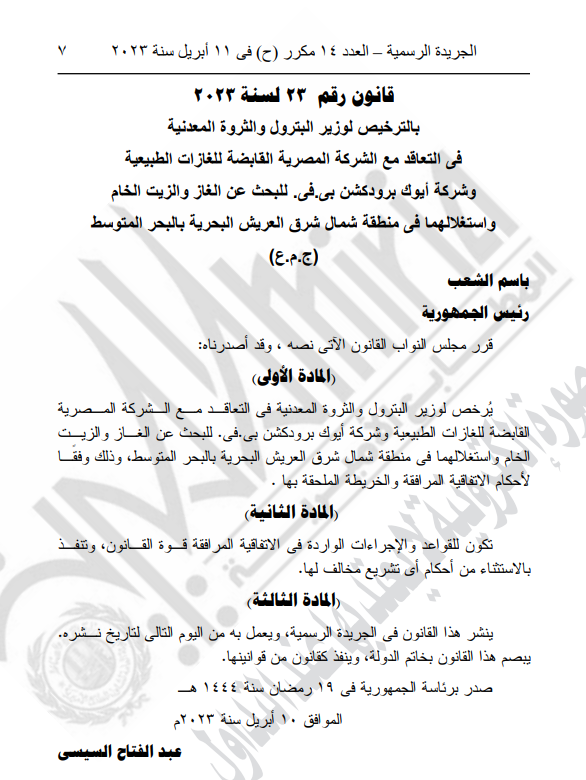 2- قانون رقم 23 لسنة 2023 بالترخيص لوزير البترول والثروة المعدنية في التعاقد مع الشركة المصرية القابضة للغازات الطبيعية وشركة أيوك برودكشن بي. في. للبحث عن الغاز والزيت الخام واستغلالهما في منطقة شمال شرق العريش البحرية بالبحر المتوسط.