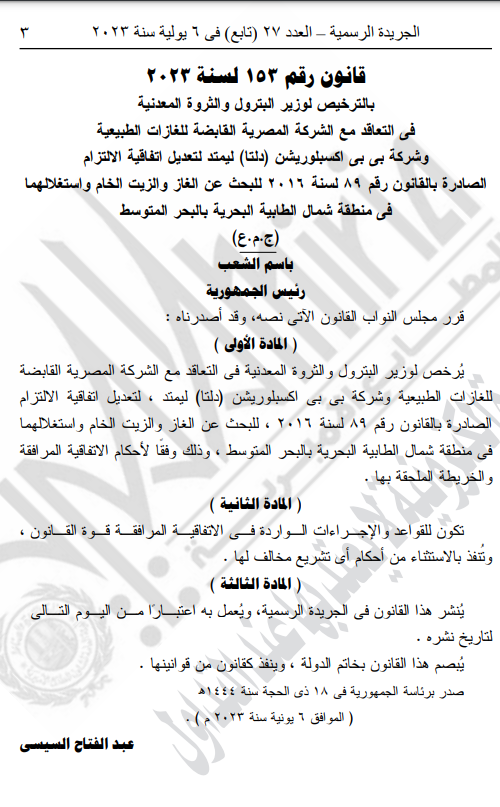 3- قانون رقم ١153 لسنة 2023 بالترخيص لوزير البترول والثروة المعدنية في التعاقد مع الشركة المصرية القابضة للغازات الطبيعية وشركة بي بي اكسبلوريشن دلتا ليمتد لتعديل اتفاقية الالتزام الصادرة بالقانون رقم 89 لسنة 2016 للبحث عن الغاز والزيت الخام واستغلالهما في منطقة شمال الطابية البحرية بالبحر المتوسط.
