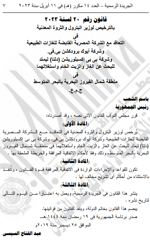 1- قانون رقم 20 لسنة 2023 بالترخيص لوزير البترول والثروة المعدنية في التعاقد مع الشركة المصرية القابضة للغازات الطبيعية وشركة أيوك برودكشن بي. في. وشركة بي بي إكسبلوريشن دلتا ليمتد للبحث عن الغاز والزيت الخام واستغلالهما فى منطقة شمال الفيروز البحرية بالبحر المتوسط ج. م. ع.