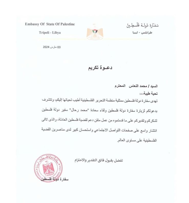 وهكذا أوضح صانع المحتوى الليبي الذي أتبع منهج صناعة المحتوى على مواقع التواصل الاجتماعي كما يجب أن تكون، ليصبح نموذج للشباب يُحتذى به، ومؤثر إيجابيا لدعم القضايا العالمية والإنسانية، خاصةً بعد أن كرمته السفارة الفلسطينية في ليبيا على هذا المنتج الفني المؤثر الذي يدعم قضية أهالي غزة وأطفال فلسطين خلال أشهر هذه الحرب القاسية.