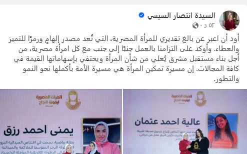 وكتبت انتصار السيسي على صفحتها الرسمية بـ فيس بوك منشورًا، معلقة: أود أن أعبر عن بالغ تقديري للمرأة المصرية التي تعد مصدر إلهام ورمزًا للتميز والعطاء، وأوكد على التزامنا بالعمل حنبًا إلى جنب مع كل امرأة مصرية من أجل بناء مستقبل مشرق يعلي من شأن المرأة ويحتفي بإسهاماتها القيمة في كافة المجالات، إن مسيرة تمكين المرأة هي مسيرة الأمة بأكملها نحو النمو والتطور.