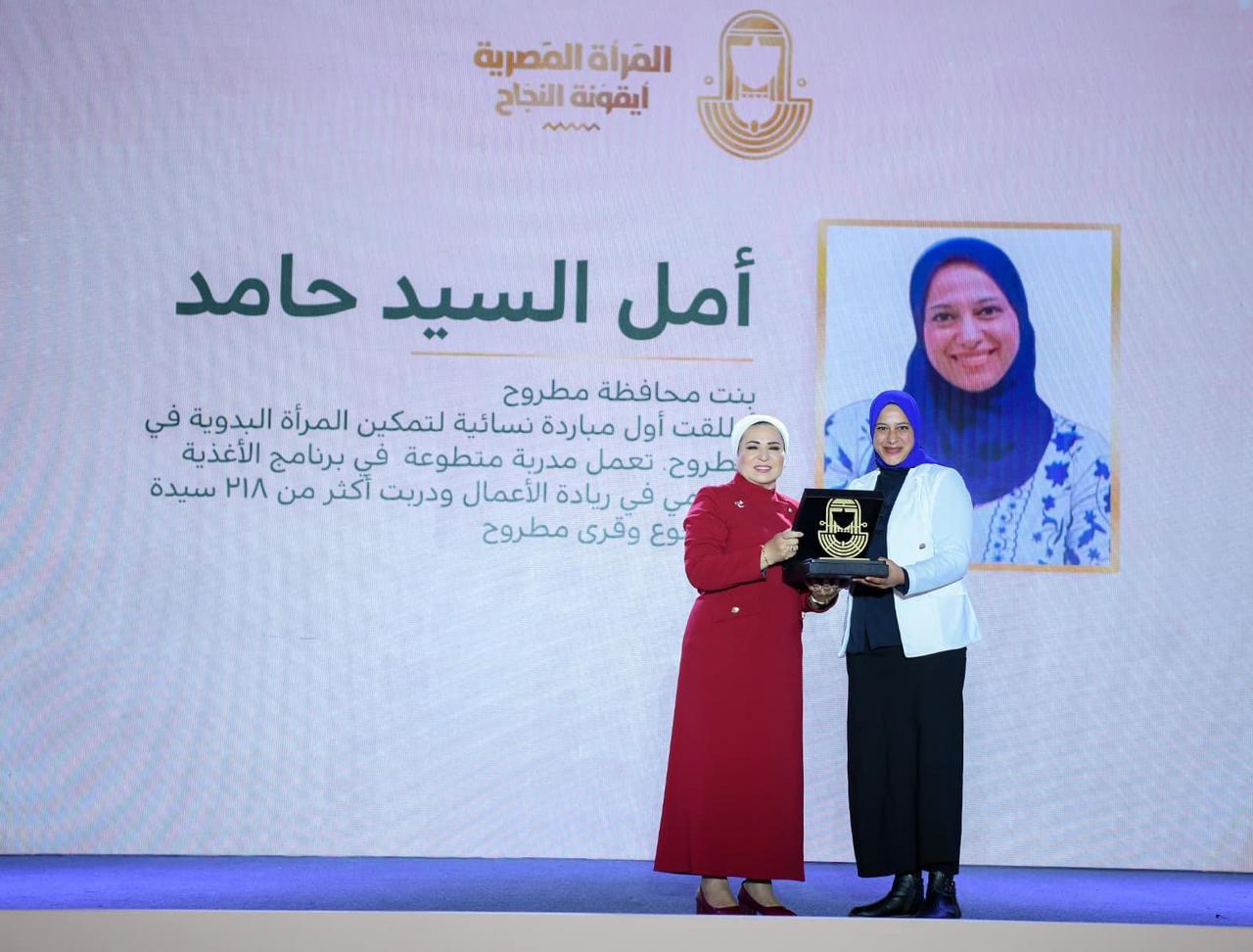 وأضافت المهندسة أمل السيد حامد، أول ما طلعت عشان استلم التكريم، سلمت على السيدة انتصار السيسي وكنت بقولها قلبي هيقف من الفرحة، وهي قالتلي بعيد الشر عليكي أنا فخورة بيكي، وكلامها ليا حسسني إني طلعت السما ونزلت تاني، ولحظة التكريم حملت الكثير من المشاعر.