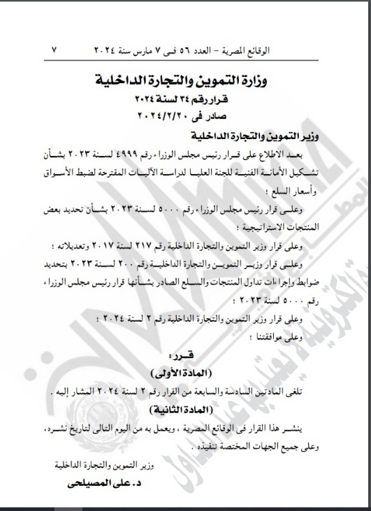 نشرت الجريدة الرسمية قرار وزارة التموين والتجارة الداخلية رقم 34 لسنة 2024، بشأن تشكيل الأمانة الفنية للجنة العليا لدراسة الآليات المقترحة لضبط الأسواق وأسعار السلع.