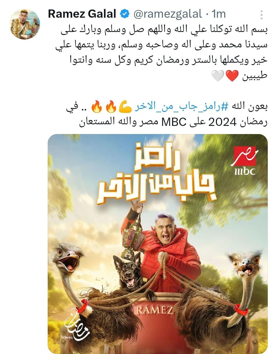وفي السياق ذاته كتب رامز جلال على البوستر الرسمي لبرنامج رامز جاب من الآخر عبر حسابه الشخصي بموقع التدوينات X، قائلًا: بسم الله توكلنا على الله واللهم صل وسلم وبارك على سيدنا محمد وعلى آله وصحبه وسلم، وربنا يتمها على خير ويكملها بالستر ورمضان كريم وكل سنة وأنتو طيبين.. رامز جاب من الآخر.. في رمضان 2024 على MBC مصر والله المستعان.