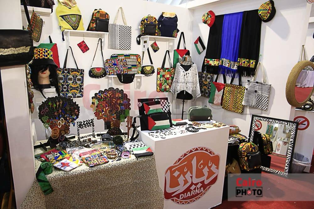 بمجرد أن تخطو خطواتك الأولى بمعرض ديارنا، يخطف أعينك الجناح الفلسطيني، حيث تقف السيدة الفلسطينية لأول مرة بين أروقة المعرض، متزينة بالكوفية الفلسطينية الشهيرة وعلم العزة حول عنقها، بين معروضات ومنتجات جميعها صنعت بأيادي فلسطينية خالصة، من عباءات تراثية وأتواب وشيلان، ومنتجات خشبية كلها تحمل الهوية الفلسطينية، صنعوا بكل الحب من قبل أكثر من 70 سيدة فلسطينية مقيمة في مصر.